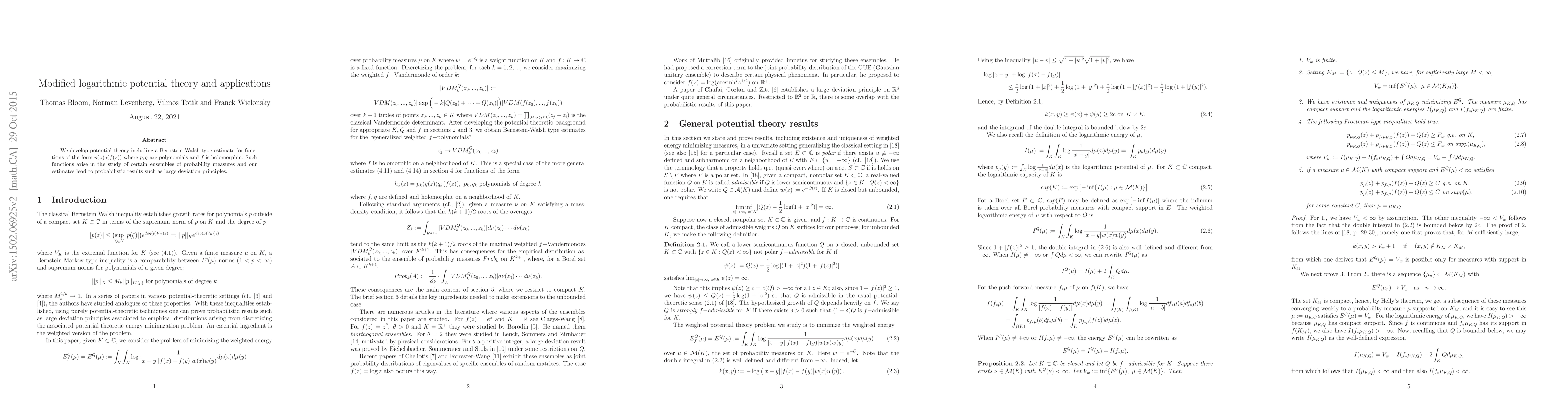 This paper introduces a modified logarithmic potential theory with a Bernstein-Walsh type estimate for polynomial functions of holomorphic mappings, leading to probabilistic results like large deviation principles in the study of probability measure ensembles.