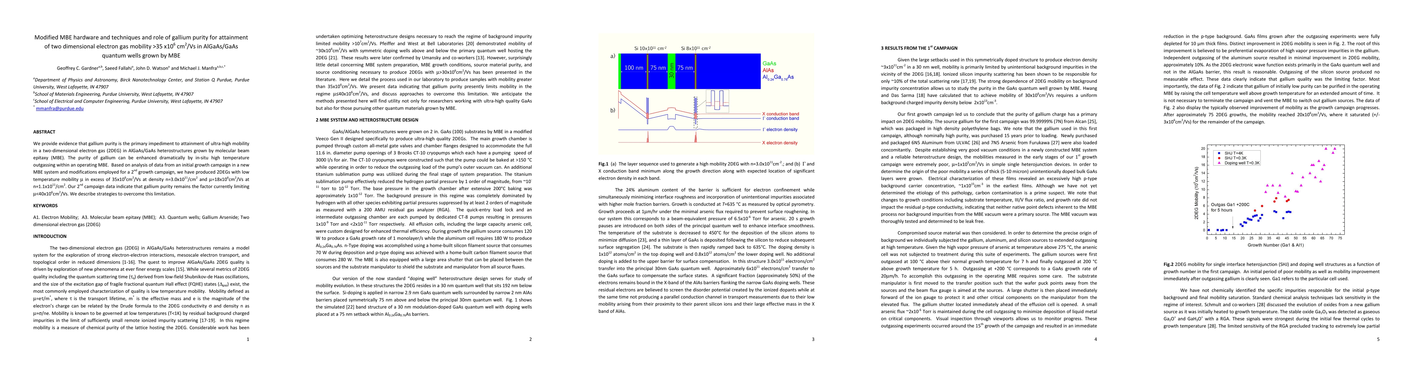 We provide evidence that gallium purity is the primary impediment to attainment of ultra-high mobility in a two-dimensional electron gas (2DEG) in AlGaAs/GaAs heterostructures grown by molecular beam epitaxy (MBE). The purity of gallium can be enhanced dramatically by in-situ high temperature outgassing within an operating MBE. Based on analysis of data from an initial growth campaign in a new MBE system and modifications employed for a 2nd growth campaign, we have produced 2DEGs with low temperature mobility in excess of 35x10^6cm2/Vs at density n=3.0x10^11/cm2 and mobility 18x10^6cm2/Vs at n=1.1x1011/cm2. Our 2nd campaign data indicate that gallium purity remains the factor currently limiting mobility <40x10^6cm2/Vs. We describe strategies to overcome this limitation.