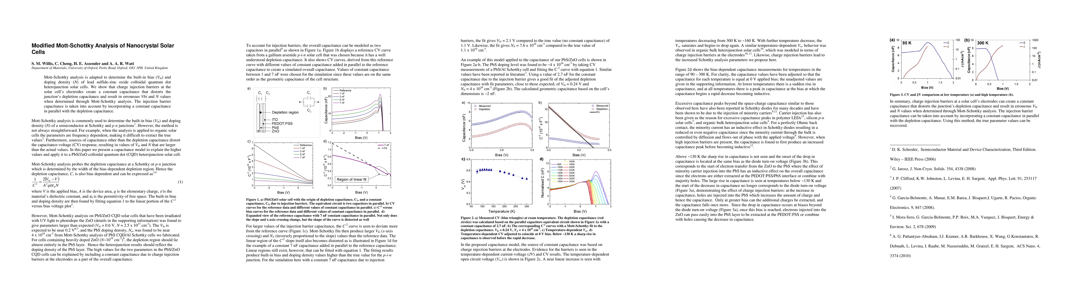 This paper modifies the Mott-Schottky analysis to accurately determine the built-in bias and doping density in lead sulfide-zinc oxide colloidal quantum dot solar cells, addressing distortions caused by charge injection barriers at the electrodes. A constant capacitance is incorporated to correct for these distortions.