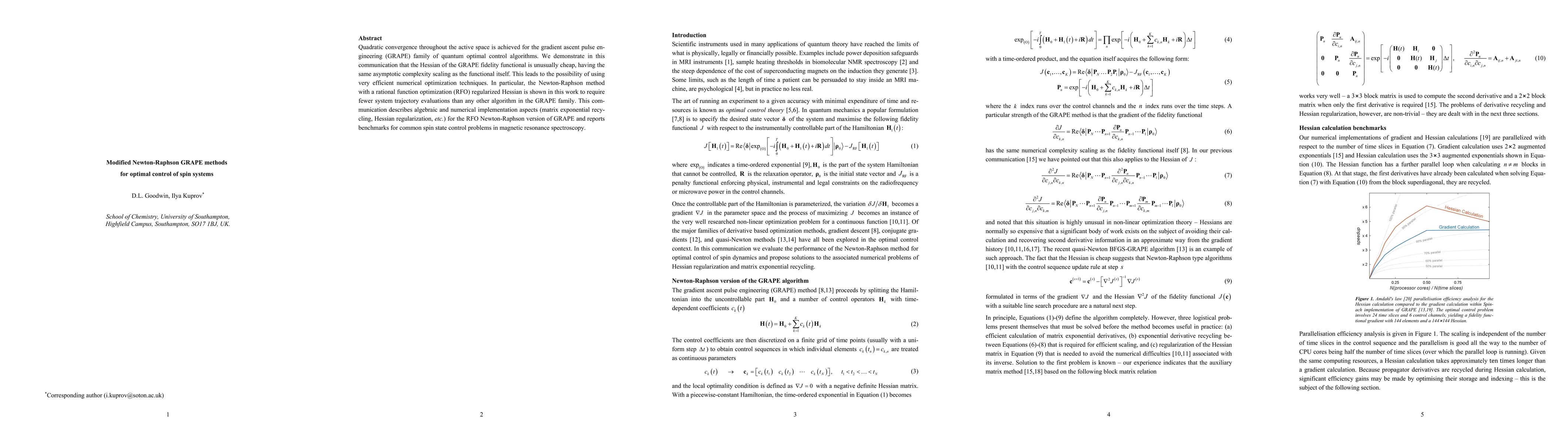 This paper presents a modified Newton-Raphson GRAPE method that achieves quadratic convergence for quantum optimal control, utilizing a regularized Hessian to require fewer system trajectory evaluations than other GRAPE algorithms. Benchmarks demonstrate its efficiency for spin state control problems in magnetic resonance spectroscopy.