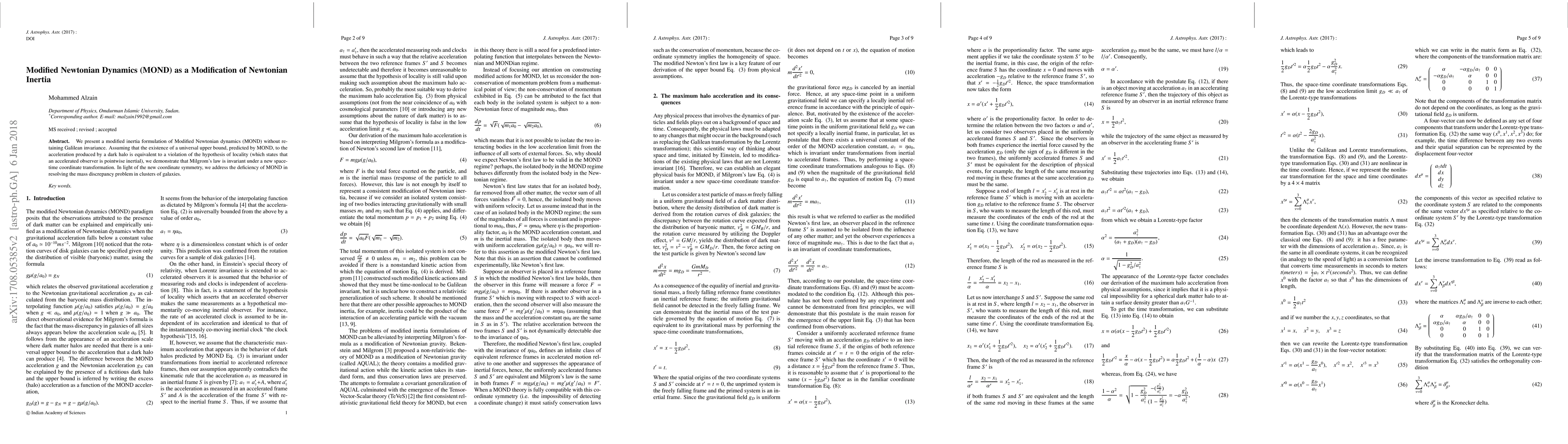 We present a modified inertia formulation of Modified Newtonian dynamics (MOND) without retaining Galilean invariance. Assuming that the existence of a universal upper bound, predicted by MOND, to the acceleration produced by a dark halo is equivalent to a violation of the hypothesis of locality (which states that an accelerated observer is pointwise inertial), we demonstrate that Milgrom's law is invariant under a new space-time coordinate transformation. In light of the new coordinate symmetry, we address the deficiency of MOND in resolving the mass discrepancy problem in clusters of galaxies.