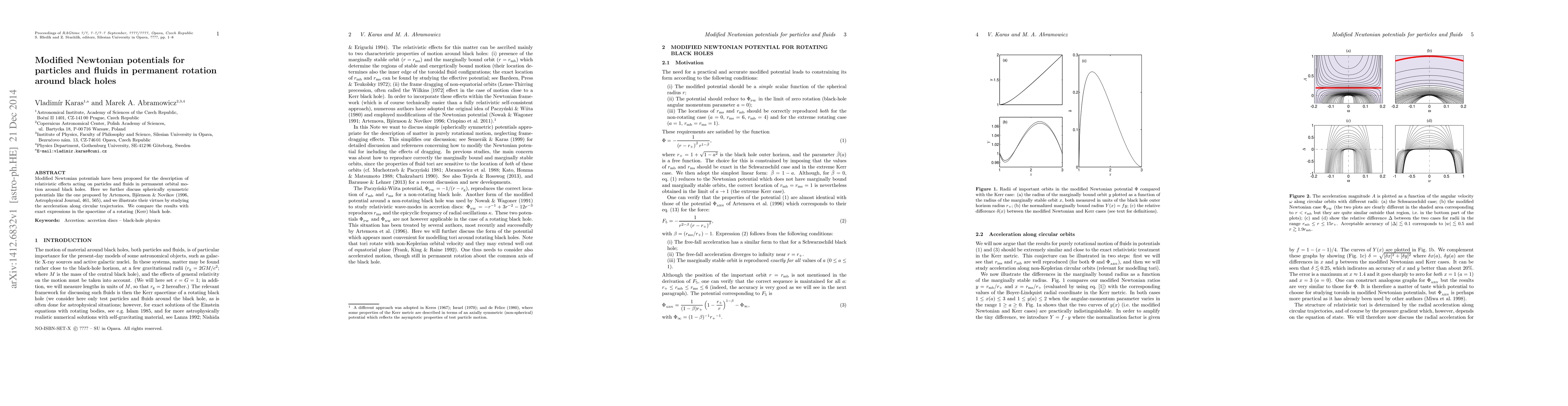 This paper explores modified Newtonian potentials for particles and fluids in permanent rotation around black holes, comparing them to exact relativistic expressions in the Kerr black hole spacetime, and highlights their effectiveness in describing acceleration along circular orbits.