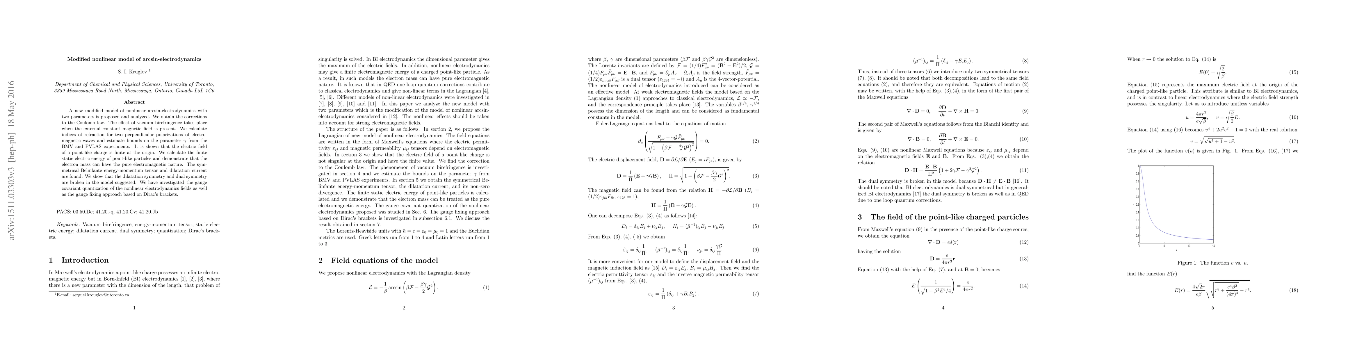 This paper proposes a modified nonlinear arcsin-electrodynamics model with two parameters, deriving corrections to the Coulomb law and analyzing vacuum birefringence under a constant magnetic field. The study also calculates finite static electric energy and suggests the electron mass could have an electromagnetic origin, while discussing the broken symmetries and gauge covariant quantization of the model.