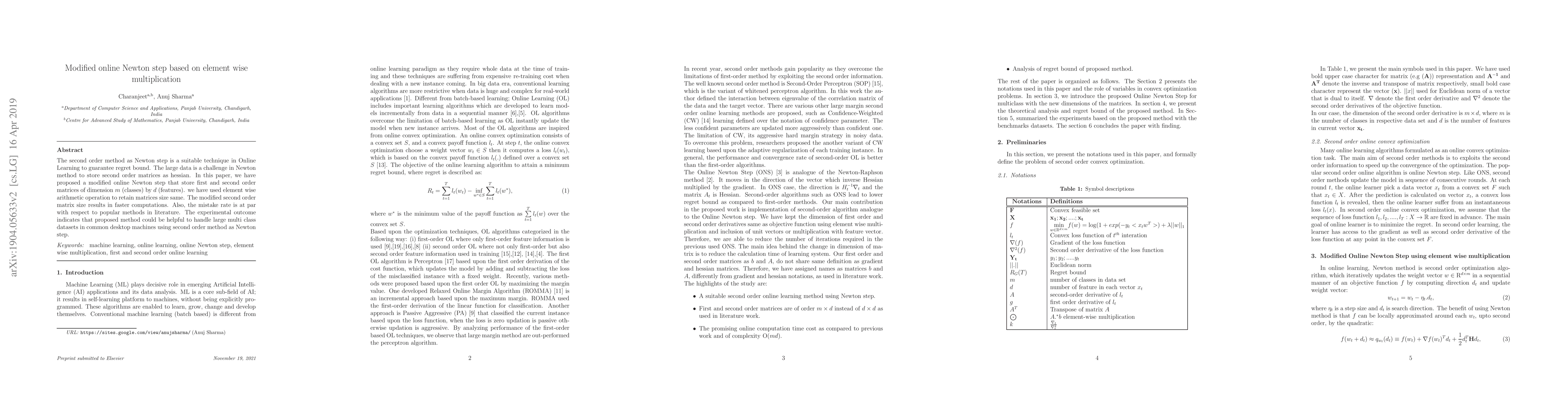 The second order method as Newton Step is a suitable technique in Online Learning to guarantee regret bound. The large data is a challenge in Newton method to store second order matrices as hessian. In this paper, we have proposed an modified online Newton step that store first and second order matrices of dimension m (classes) by d (features). we have used element wise arithmetic operation to retain matrices size same. The modified second order matrix size results in faster computations. Also, the mistake rate is at par with respect to popular methods in literature. The experiments outcome indicate that proposed method could be helpful to handle large multi class datasets in common desktop machines using second order method as Newton step.