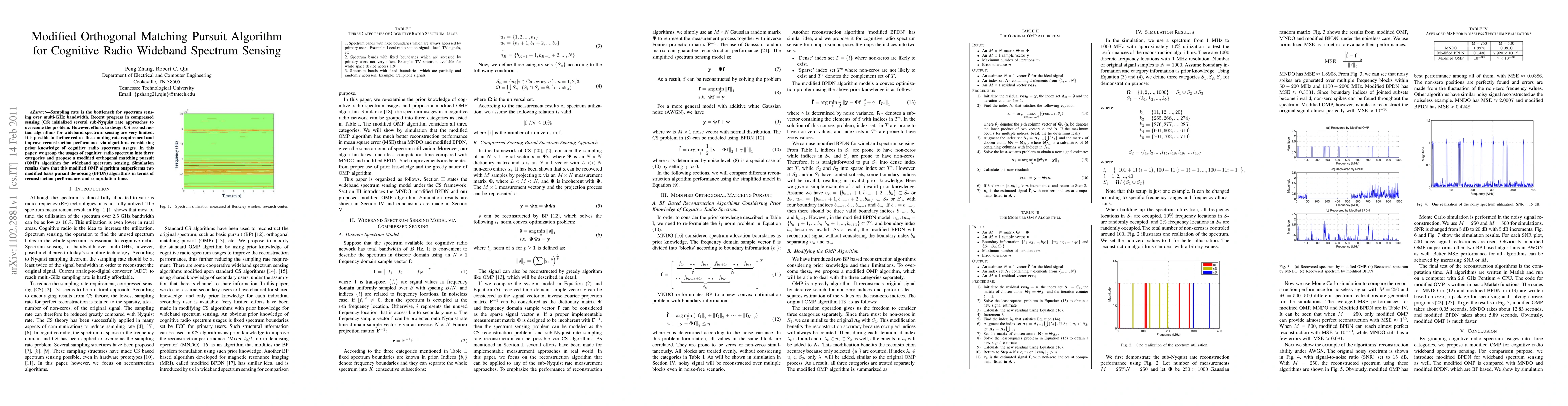 This paper proposes a modified orthogonal matching pursuit (OMP) algorithm for wideband spectrum sensing in cognitive radio, aiming to reduce sampling rate requirements and improve reconstruction performance. Simulation results demonstrate that the modified OMP outperforms two modified basis pursuit de-noising (BPDN) algorithms in both reconstruction accuracy and computational efficiency.
