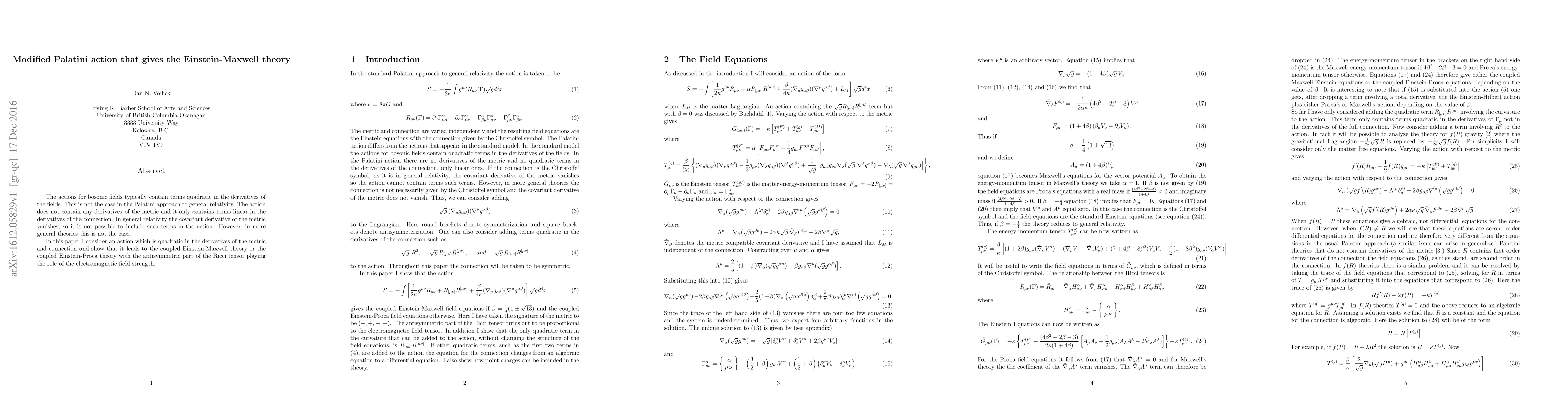 This paper proposes a modified Palatini action that incorporates quadratic terms in the derivatives of both the metric and the connection, leading to the Einstein-Maxwell theory. It demonstrates how this approach can generate coupled Einstein-Proca theory with the antisymmetric Ricci tensor representing the electromagnetic field strength.