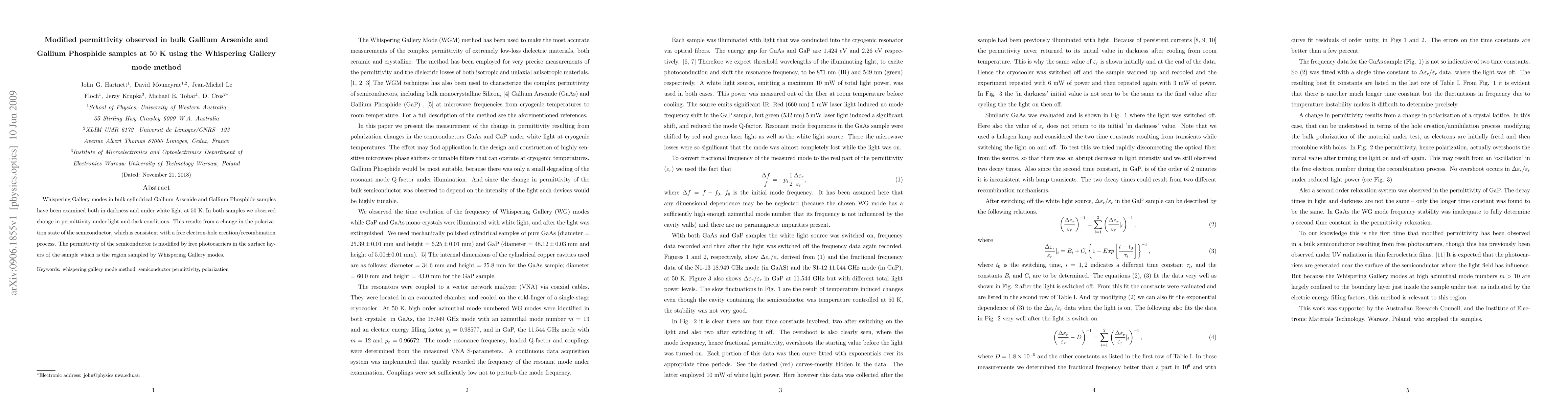Whispering Gallery modes in bulk cylindrical Gallium Arsenide and Gallium Phosphide samples have been examined both in darkness and under white light at 50 K. In both samples we observed change in permittivity under light and dark conditions. This results from a change in the polarization state of the semiconductor, which is consistent with a free electron-hole creation/recombination process. The permittivity of the semiconductor is modified by free photocarriers in the surface layers of the sample which is the region sampled by Whispering Gallery modes.