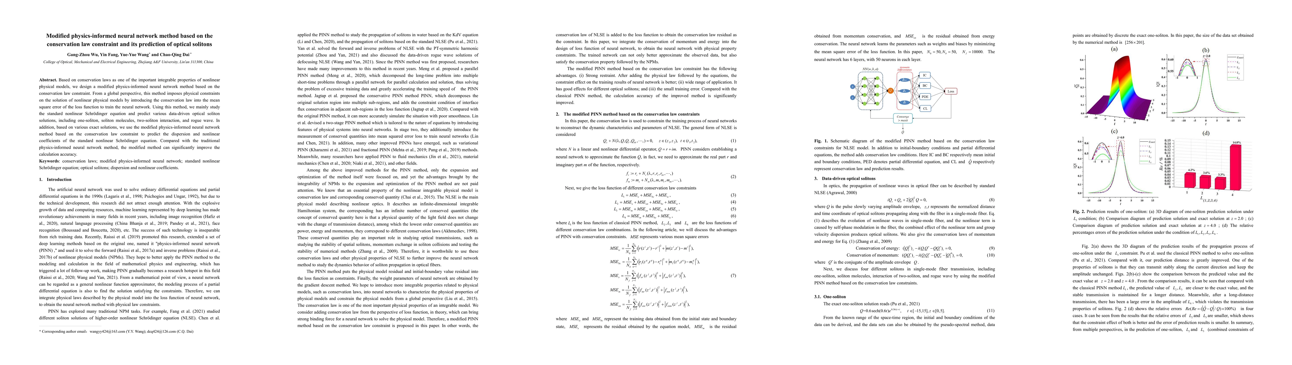 This paper proposes a modified physics-informed neural network method incorporating conservation law constraints to enhance the accuracy of predicting optical soliton solutions. The method improves the traditional approach by integrating conservation laws into the loss function, achieving higher precision in modeling the standard nonlinear Schrödinger equation and predicting various soliton phenomena.