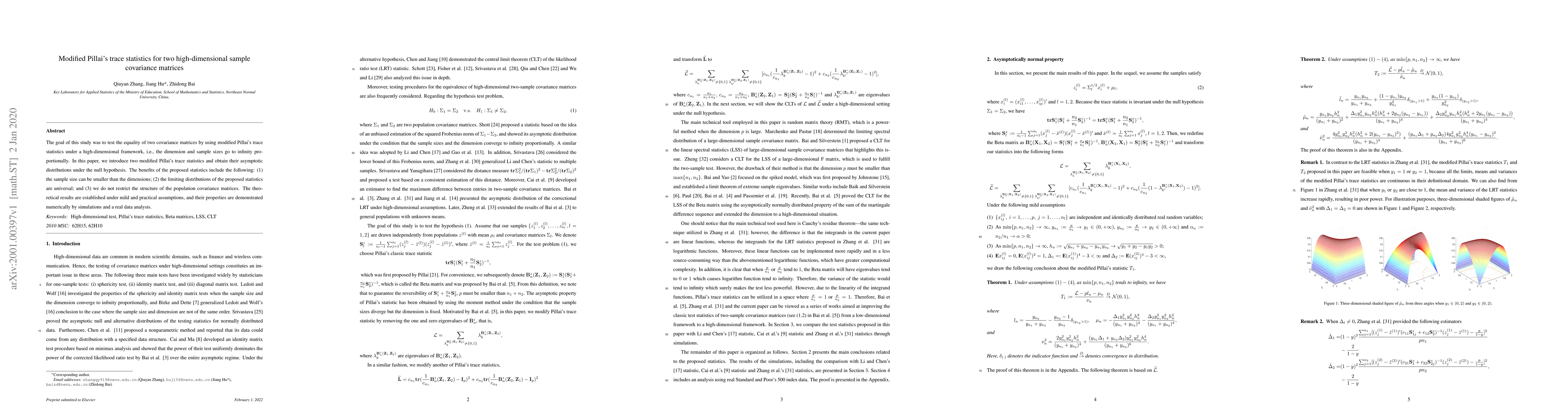 This study proposes modified Pillai's trace statistics for testing equality of two high-dimensional covariance matrices, allowing sample sizes to be smaller than dimensions. The proposed statistics have universal limiting distributions under mild assumptions, demonstrated through simulations and real data analysis.