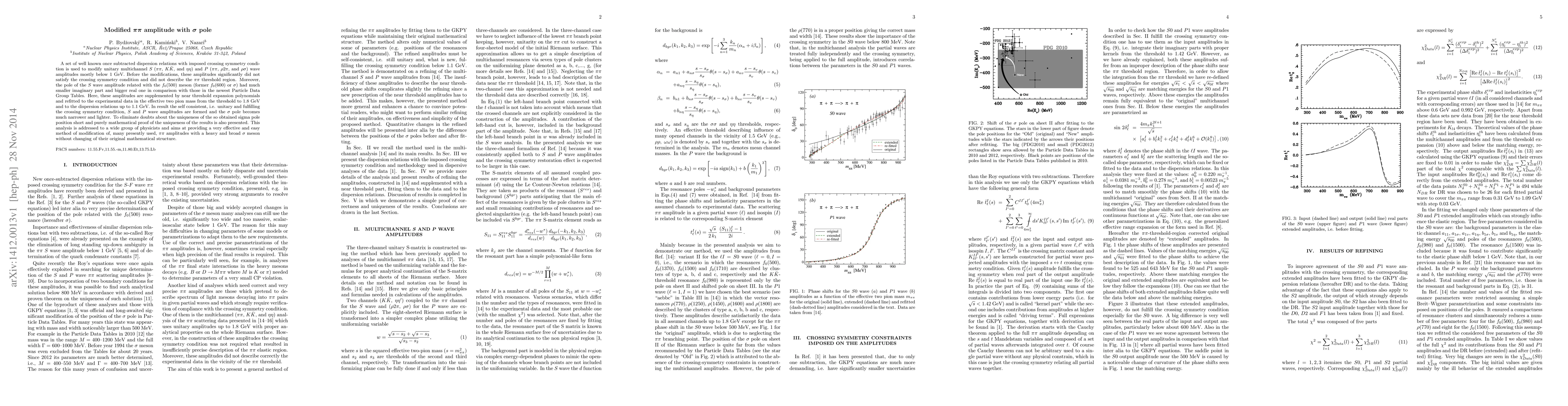 A set of well known once subtracted dispersion relations with imposed crossing symmetry condition is used to modify unitary multichannel $S$ ($\pi\pi$, $K \bar K$, and $\eta\eta$) and $P$ ($\pi\pi$, $\rho 2\pi$, and $\rho\sigma$) wave amplitudes mostly below 1 GeV. Before the modifications, these amplitudes significantly did not satisfy the crossing symmetry condition and did not describe the $\pi\pi$ threshold region. Moreover, the pole of the $S$ wave amplitude related with the $f_0(500)$ meson (former $f_0(600)$ or $\sigma$) had much smaller imaginary part and bigger real one in comparison with those in the newest Particle Data Group Tables. Here, these amplitudes are supplemented by near threshold expansion polynomials and refitted to the experimental data in the effective two pion mass from the threshold to 1.8 GeV and to the dispersion relations up to 1.1 GeV. In result the self consistent, i.e. unitary and fulfilling the crossing symmetry condition, $S$ and $P$ wave amplitudes are formed and the $\sigma$ pole becomes much narrower and lighter. To eliminate doubts about the uniqueness of the so obtained sigma pole position short and purely mathematical proof of the uniqueness of the results is also presented. This analysis is addressed to a wide group of physicists and aims at providing a very effective and easy method of modification of, many presently used, $\pi\pi$ amplitudes with a heavy and broad $\sigma$ meson without changing of their original mathematical structure.