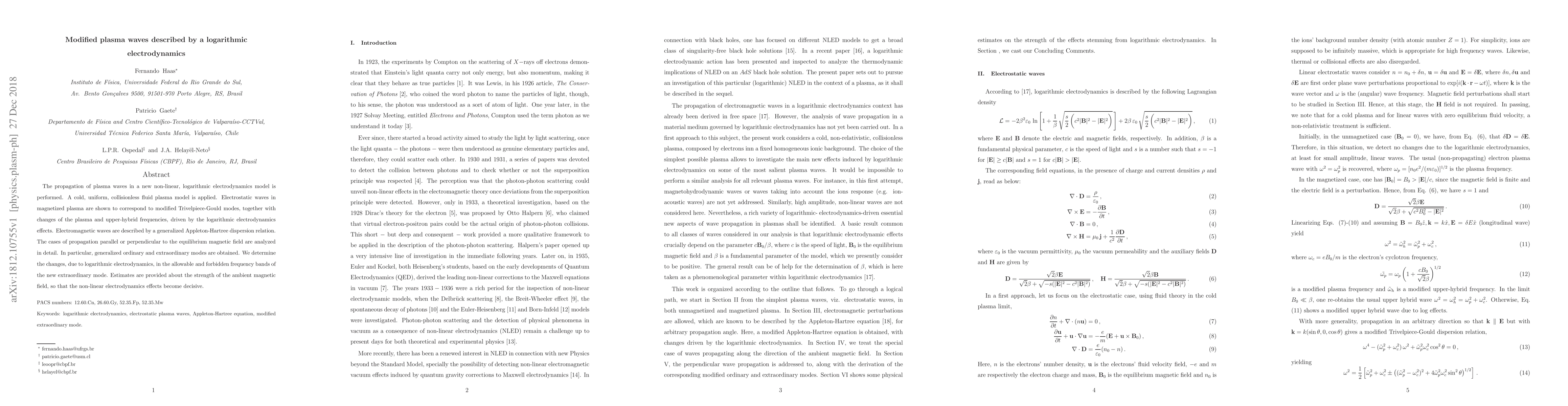 This paper investigates the propagation of plasma waves using a new non-linear, logarithmic electrodynamics model, revealing modified Trivelpiece-Gould modes and changes in plasma frequencies. It also derives generalized dispersion relations for electromagnetic waves, analyzing the effects on frequency bands and determining conditions under which non-linear electrodynamics becomes significant.