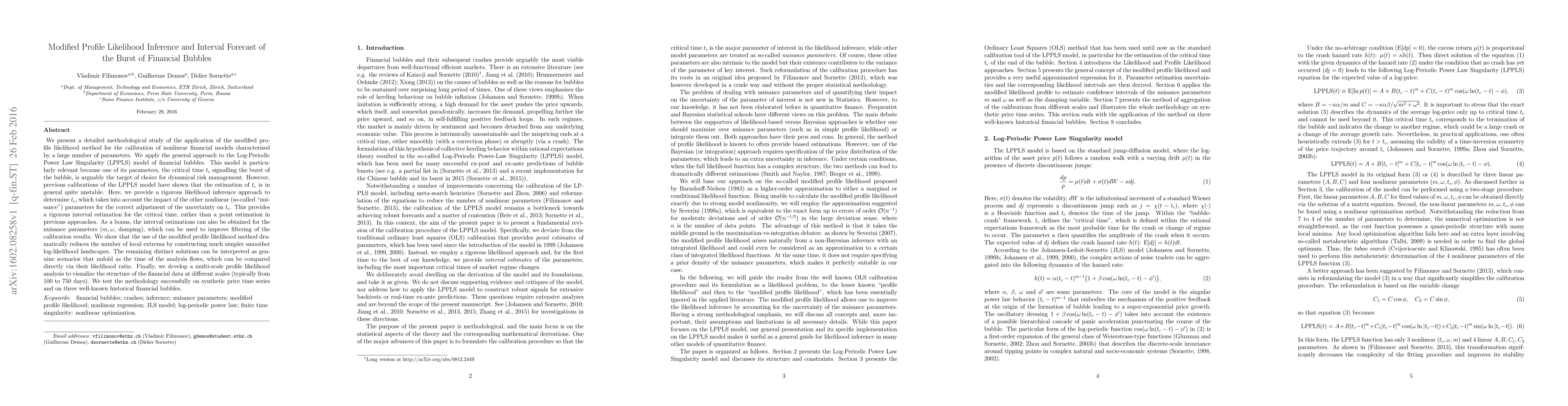 We present a detailed methodological study of the application of the modified profile likelihood method for the calibration of nonlinear financial models characterised by a large number of parameters. We apply the general approach to the Log-Periodic Power Law Singularity (LPPLS) model of financial bubbles. This model is particularly relevant because one of its parameters, the critical time $t_c$ signalling the burst of the bubble, is arguably the target of choice for dynamical risk management. However, previous calibrations of the LPPLS model have shown that the estimation of $t_c$ is in general quite unstable. Here, we provide a rigorous likelihood inference approach to determine $t_c$, which takes into account the impact of the other nonlinear (so-called "nuisance") parameters for the correct adjustment of the uncertainty on $t_c$. This provides a rigorous interval estimation for the critical time, rather than a point estimation in previous approaches. As a bonus, the interval estimations can also be obtained for the nuisance parameters ($m,\omega$, damping), which can be used to improve filtering of the calibration results. We show that the use of the modified profile likelihood method dramatically reduces the number of local extrema by constructing much simpler smoother log-likelihood landscapes. The remaining distinct solutions can be interpreted as genuine scenarios that unfold as the time of the analysis flows, which can be compared directly via their likelihood ratio. Finally, we develop a multi-scale profile likelihood analysis to visualize the structure of the financial data at different scales (typically from 100 to 750 days). We test the methodology successfully on synthetic price time series and on three well-known historical financial bubbles.