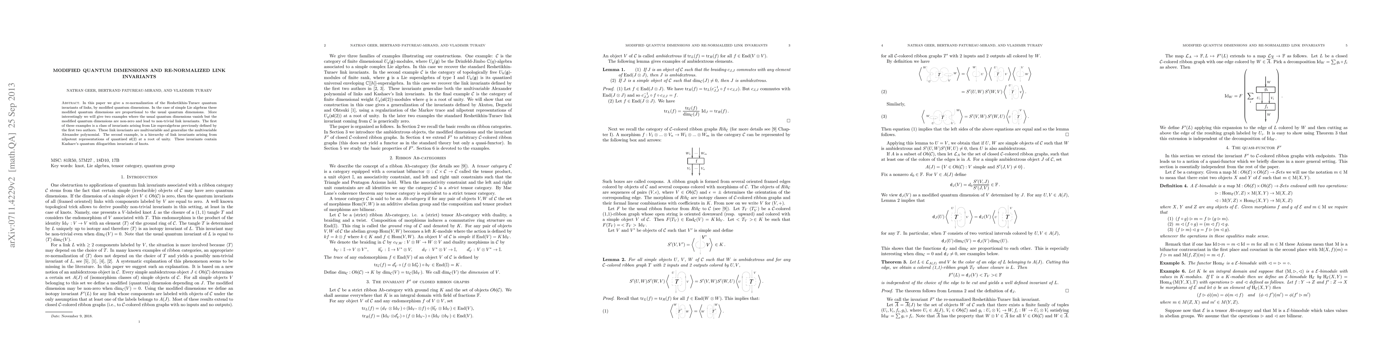 In this paper we give a re-normalization of the Reshetikhin-Turaev quantum invariants of links, by modified quantum dimensions. In the case of simple Lie algebras these modified quantum dimensions are proportional to the usual quantum dimensions. More interestingly we will give two examples where the usual quantum dimensions vanish but the modified quantum dimensions are non-zero and lead to non-trivial link invariants. The first of these examples is a class of invariants arising from Lie superalgebras previously defined by the first two authors. These link invariants are multivariable and generalize the multivariable Alexander polynomial. The second example, is a hierarchy of link invariants arising from nilpotent representations of quantized sl(2) at a root of unity. These invariants contain Kashaev's quantum dilogarithm invariants of knots.