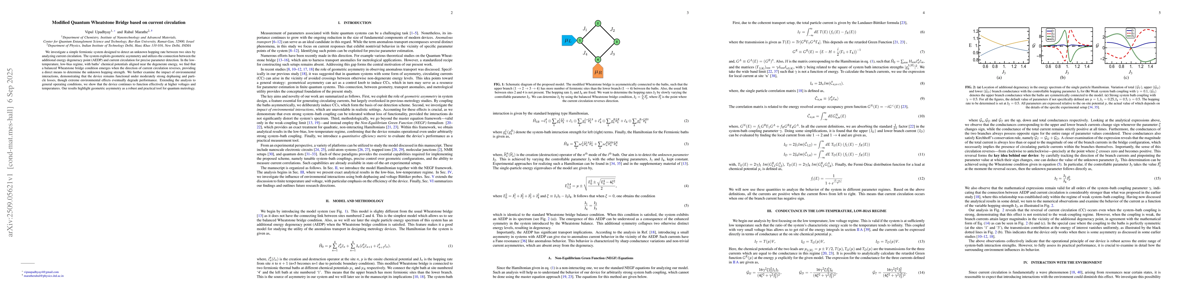 We investigate a simple fermionic system designed to detect an unknown hopping rate between two sites by analyzing current circulation. The system exploits geometric asymmetry and utilizes the connection between the additional energy degeneracy point (AEDP) and current circulation for precise parameter detection. In the low-temperature, low-bias regime, with baths chemical potentials aligned near the degenerate energy, we find that a balanced Wheatstone bridge condition emerges when the direction of current circulation reverses, providing a direct means to determine the unknown hopping strength. We further examine the impact of environmental interactions, demonstrating that the device remains functional under moderately strong dephasing and particle losses, though extreme environmental effects eventually degrade performance. Extending the analysis to general operating conditions, we show that the device continues to function effectively at higher voltages and temperatures. Our results highlight geometric asymmetry as a robust and practical tool for quantum metrology.