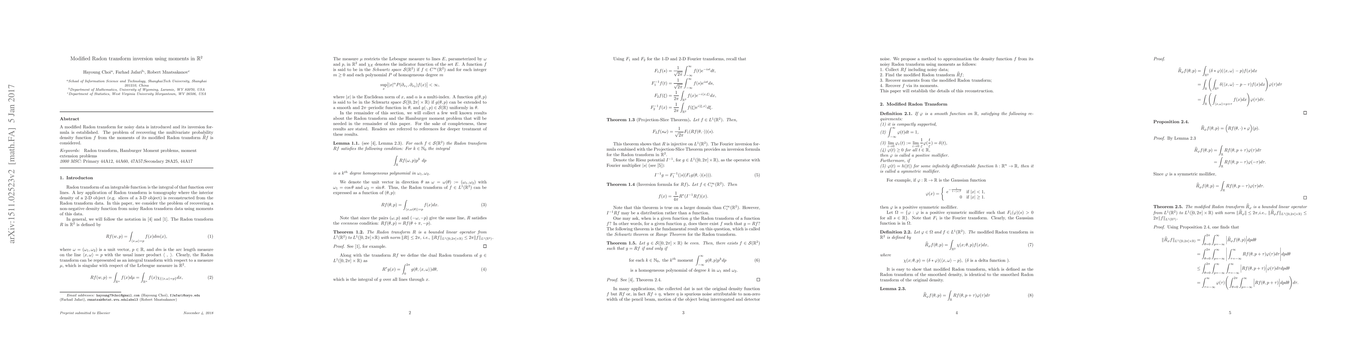 Summary: This paper introduces a modified Radon transform for noisy data and presents an inversion formula. It focuses on recovering the multivariate probability density function from the moments of its modified Radon transform.
