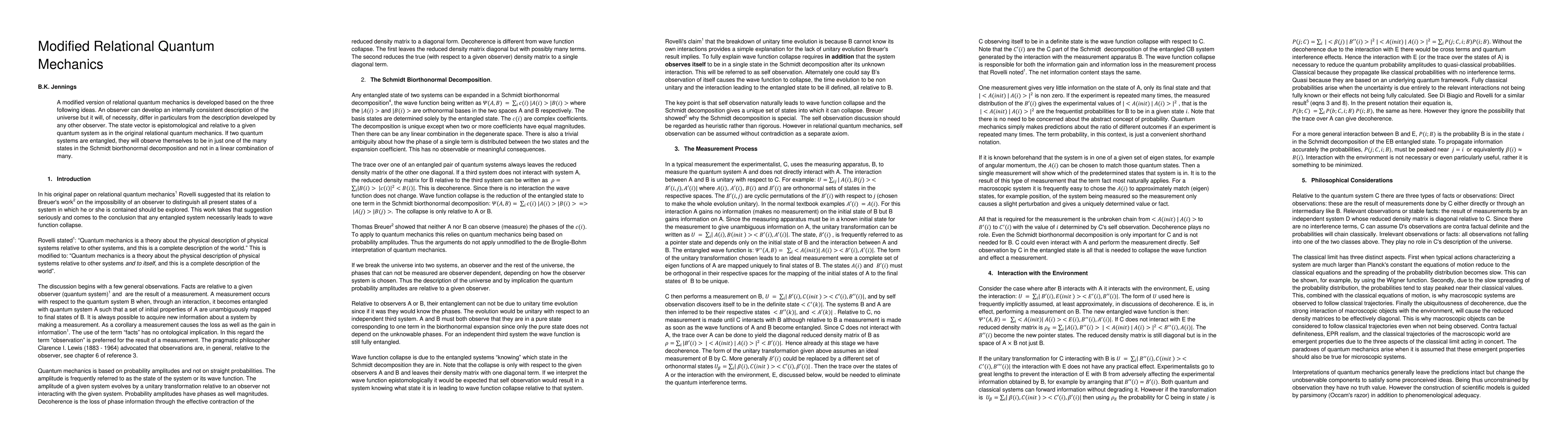 This paper proposes a modified version of relational quantum mechanics emphasizing that observers develop unique, internally consistent descriptions of the universe, and that entangled quantum systems perceive themselves in a single state from a Schmidt decomposition rather than a superposition.