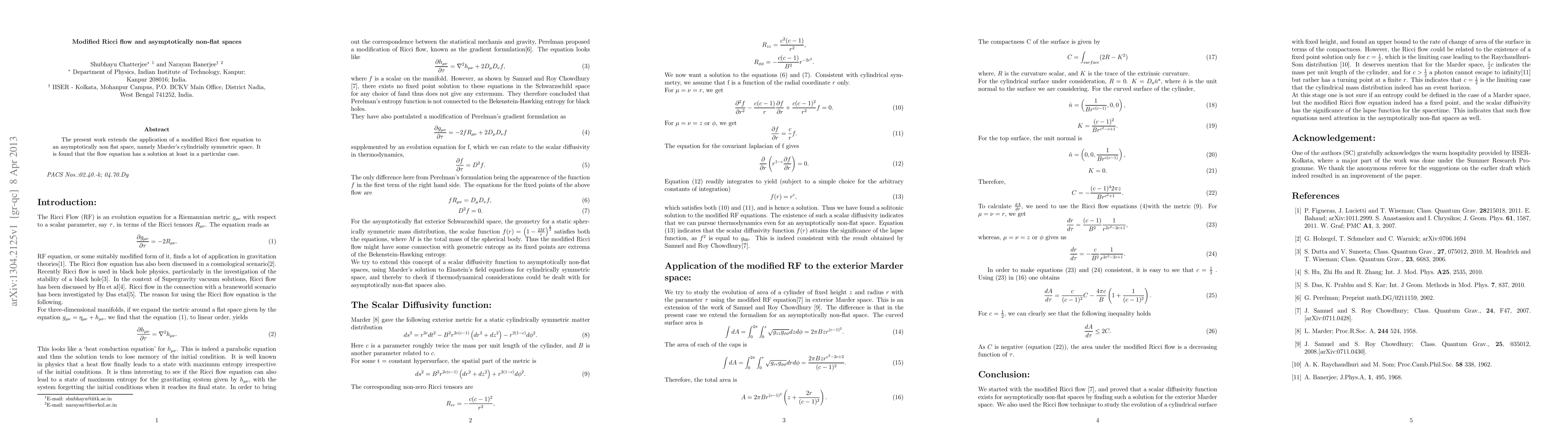 The present work extends the application of a modified Ricci flow equation to an asymptotically non flat space, namely Marder's cylindrially symmetric space. It is found that the flow equation has a solution at least in a particular case.