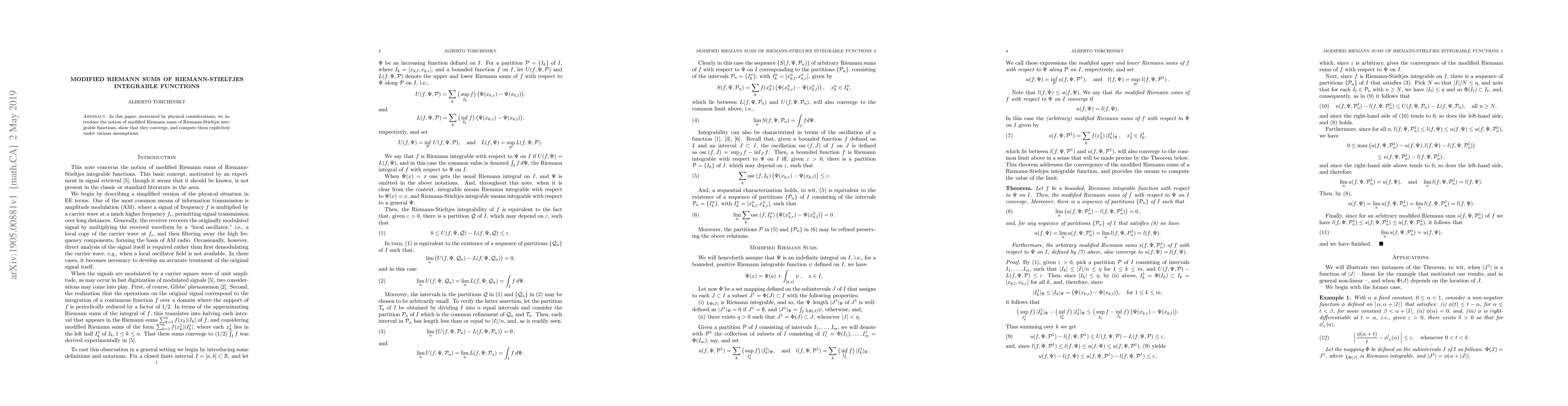 In this paper, motivated by physical considerations, we introduce the notion of modified Riemann sums of Riemann-Stieltjes integrable functions, show that they converge, and compute them explicitely under various assumptions.