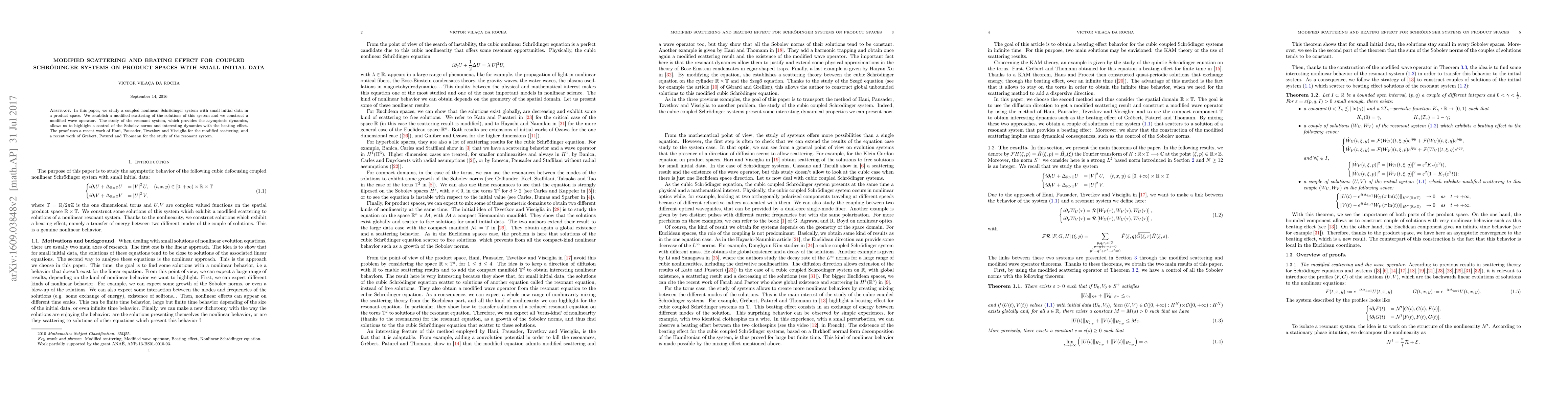 This paper investigates a coupled nonlinear Schrödinger system with small initial data in product spaces, proving modified scattering and constructing a modified wave operator. It highlights a controlled Sobolev norm and intriguing beating effect dynamics through a resonant system analysis, referencing recent works for proof.
