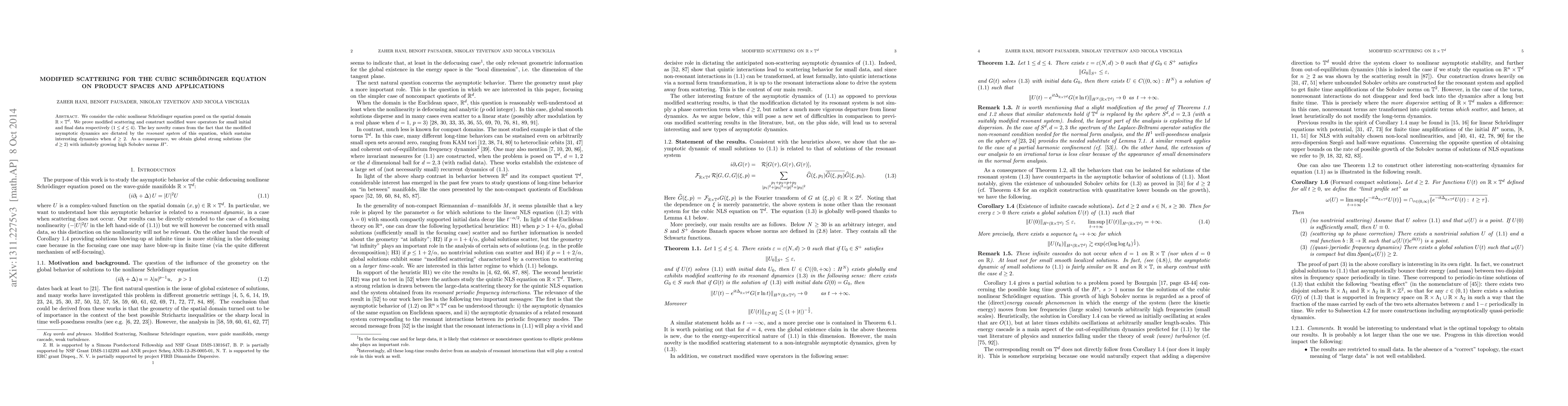 The research employs a combination of analytical techniques and numerical simulations to study the cubic nonlinear Schrödinger equation on product spaces $\mathbb{R} \times \mathbb{T}^d$ for $1 \leq d \leq 4$. The authors prove modified scattering and construct modified wave operators for small initial and final data.