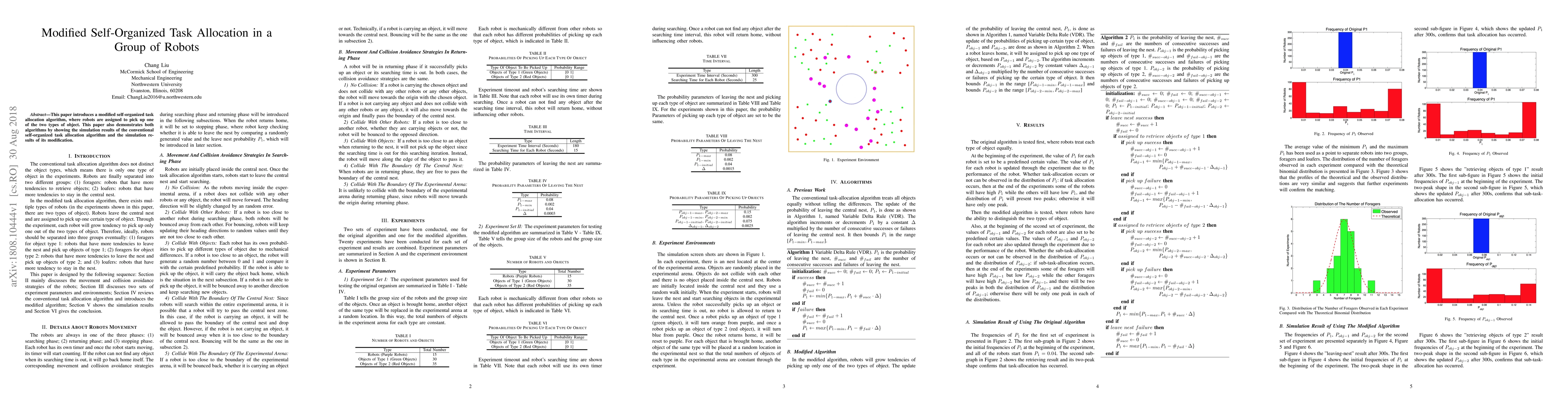 This paper proposes a modified self-organized task allocation algorithm for robots to pick up two types of objects, and presents simulation results comparing the conventional algorithm and its improved version.