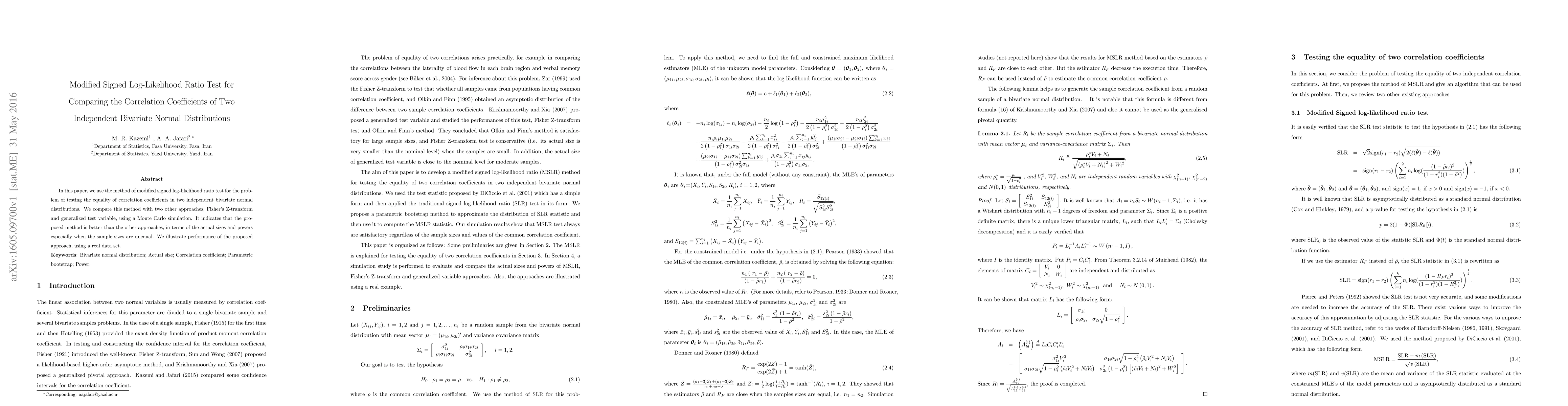 In this paper, we use the method of modified signed log-likelihood ratio test for the problem of testing the equality of correlation coefficients in two independent bivariate normal distributions. We compare this method with two other %competing approaches, Fisher's Z-transform and generalized test variable, using a Monte Carlo simulation. It indicates that the proposed method is better than the other approaches, in terms of the actual sizes and powers especially when the sample sizes are unequal. We illustrate performance of the proposed approach, using a real data set.