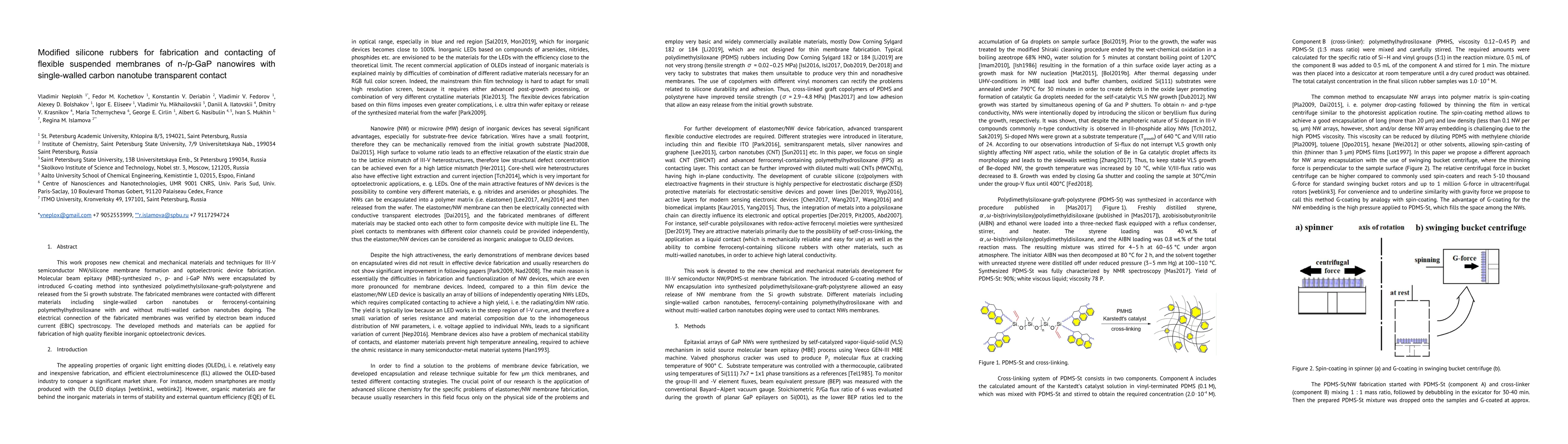 This work proposes new chemical and mechanical materials and techniques for III-V semiconductor NW/silicone membrane formation and optoelectronic device fabrication. Molecular beam epitaxy (MBE)-synthesized n-, p- and i-GaP NWs were encapsulated by introduced G-coating method into synthesized polydimethylsiloxane-graft-polystyrene and released from the Si growth substrate. The fabricated membranes were contacted with different materials including single-walled carbon nanotubes or ferrocenyl-containing polymethylhydrosiloxane with and without multi-walled carbon nanotubes doping. The electrical connection of the fabricated membranes was verified by electron beam induced current (EBIC) spectroscopy. The developed methods and materials can be applied for fabrication of high quality flexible inorganic optoelectronic devices.