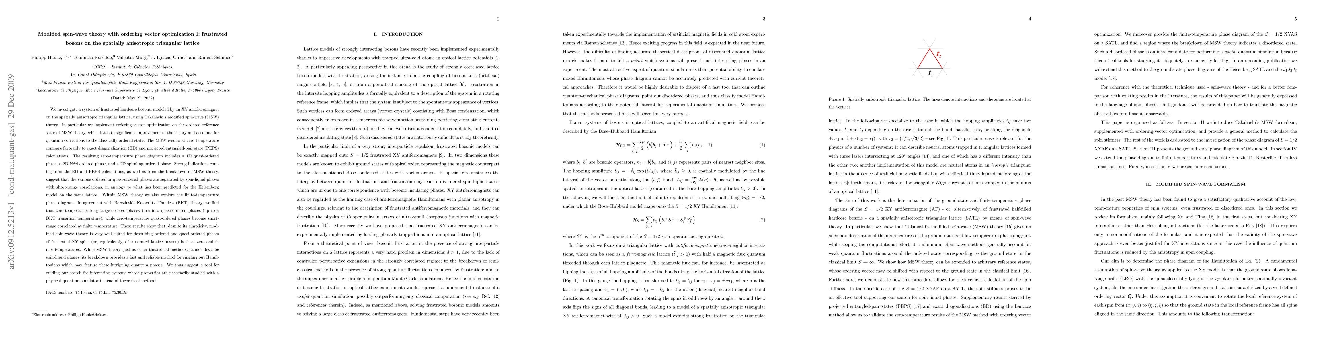 We investigate a system of frustrated hardcore bosons, modeled by an XY antiferromagnet on the spatially anisotropic triangular lattice, using Takahashi's modified spin-wave (MSW) theory. In particular we implement ordering vector optimization on the ordered reference state of MSW theory, which leads to significant improvement of the theory and accounts for quantum corrections to the classically ordered state. The MSW results at zero temperature compare favorably to exact diagonalization (ED) and projected entangled-pair state (PEPS) calculations. The resulting zero-temperature phase diagram includes a 1D quasi-ordered phase, a 2D Neel ordered phase, and a 2D spiraling ordered phase. We have strong indications that the various ordered or quasi-ordered phases are separated by spin-liquid phases with short-range correlations, in analogy to what has been predicted for the Heisenberg model on the same lattice. Within MSW theory we also explore the finite-temperature phase diagram. We find that the zero-temperature long-range-ordered phases turn into quasi-ordered phases (up to a Berezinskii-Kosterlitz-Thouless temperature), while zero-temperature quasi-ordered phases become short-range correlated at finite temperature. These results show that modified spin-wave theory is very well suited for describing ordered and quasi-ordered phases of frustrated XY spins (or, equivalently, of frustrated lattice bosons) both at zero and finite temperatures. While MSW theory, just as other theoretical methods, cannot describe spin-liquid phases, its breakdown provides a fast method for singling out Hamiltonians which may feature these intriguing quantum phases. We thus suggest a tool for guiding our search for interesting systems whose properties are necessarily studied with a physical quantum simulator.