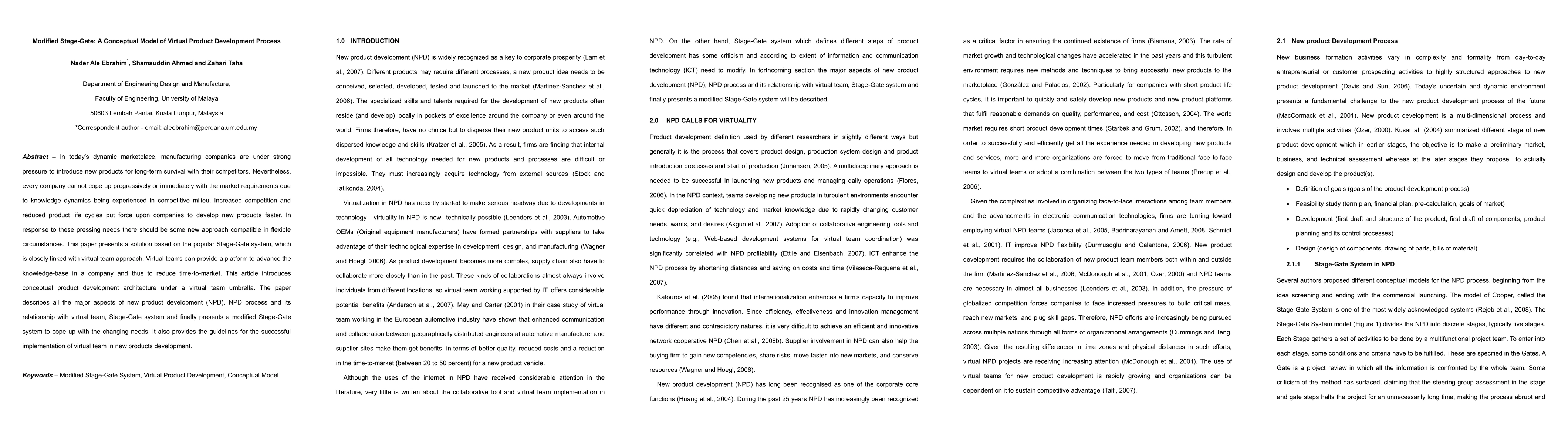 This paper proposes a modified Stage-Gate system to facilitate virtual product development in fast-paced markets, leveraging virtual teams to accelerate knowledge sharing and reduce time-to-market.