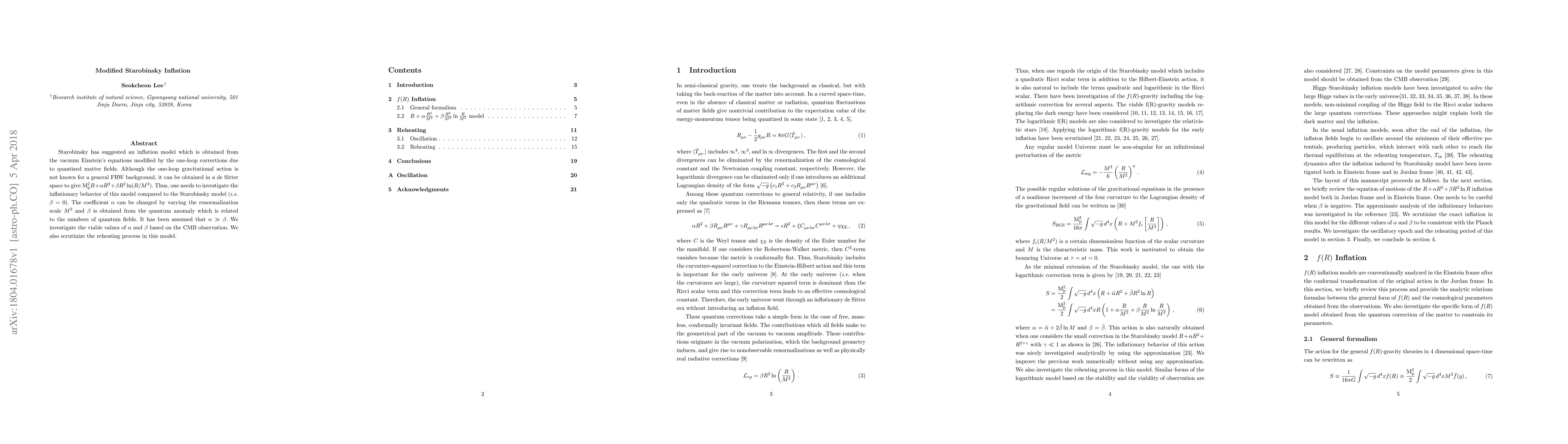 This paper explores a modified version of Starobinsky's inflation model, incorporating higher-order terms in the gravitational action derived from one-loop corrections. It investigates the inflationary dynamics and viable parameter values for $\alpha$ and $\beta$ based on CMB observations, while also examining the reheating process in this modified inflationary framework.