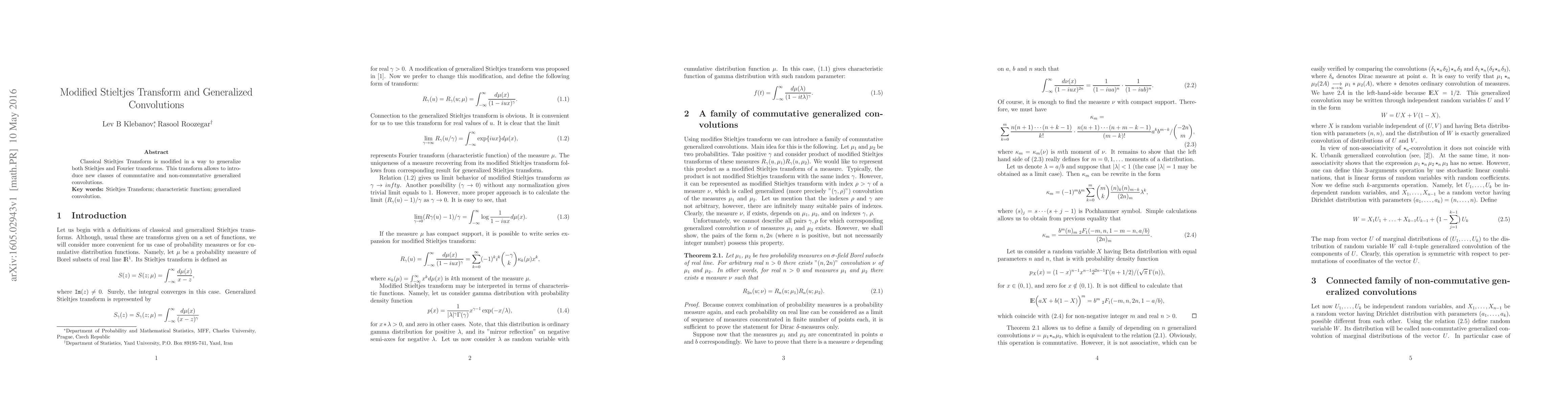 Summary: The paper modifies the classical Stieltjes Transform to generalize both Stieltjes and Fourier transforms, enabling the introduction of new commutative and non-commutative generalized convolutions. Keywords: Stieltjes Transform, characteristic function, generalized convolution.