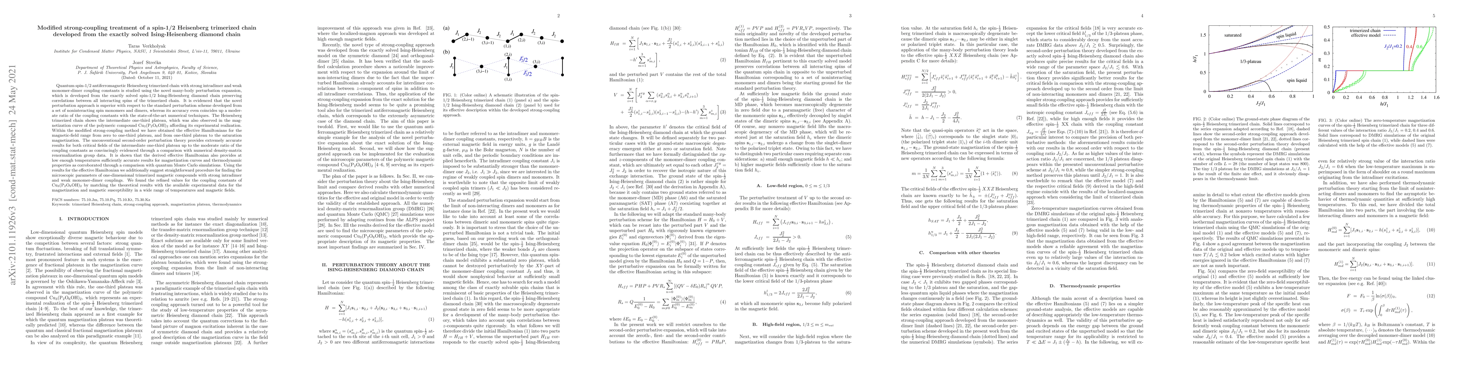 The paper develops a modified strong-coupling treatment for a spin-1/2 Heisenberg trimerized chain using a novel many-body perturbation expansion, yielding effective Hamiltonians and revealing an intermediate one-third plateau in magnetization, which aligns with experimental observations in Cu$_3$(P$_2$O$_6$OH)$_2$. The method accurately captures thermodynamic properties and provides refined coupling constants.