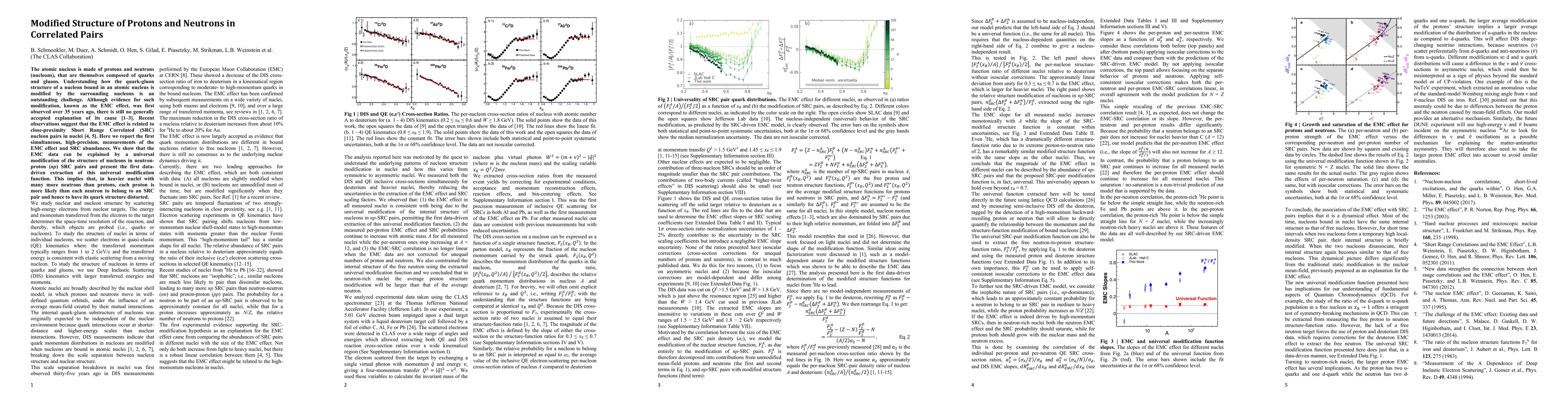 The atomic nucleus is made of protons and neutrons (nucleons), that are themselves composed of quarks and gluons. Understanding how the quark-gluon structure of a nucleon bound in an atomic nucleus is modified by the surrounding nucleons is an outstanding challenge. Although evidence for such modification, known as the EMC effect, was first observed over 35 years ago, there is still no generally accepted explanation of its cause. Recent observations suggest that the EMC effect is related to close-proximity Short Range Correlated (SRC) nucleon pairs in nuclei. Here we report the first simultaneous, high-precision, measurements of the EMC effect and SRC abundances. We show that the EMC data can be explained by a universal modification of the structure of nucleons in neutron-proton (np) SRC pairs and present the first data-driven extraction of this universal modification function. This implies that, in heavier nuclei with many more neutrons than protons, each proton is more likely than each neutron to belong to an SRC pair and hence to have its quark structure distorted.