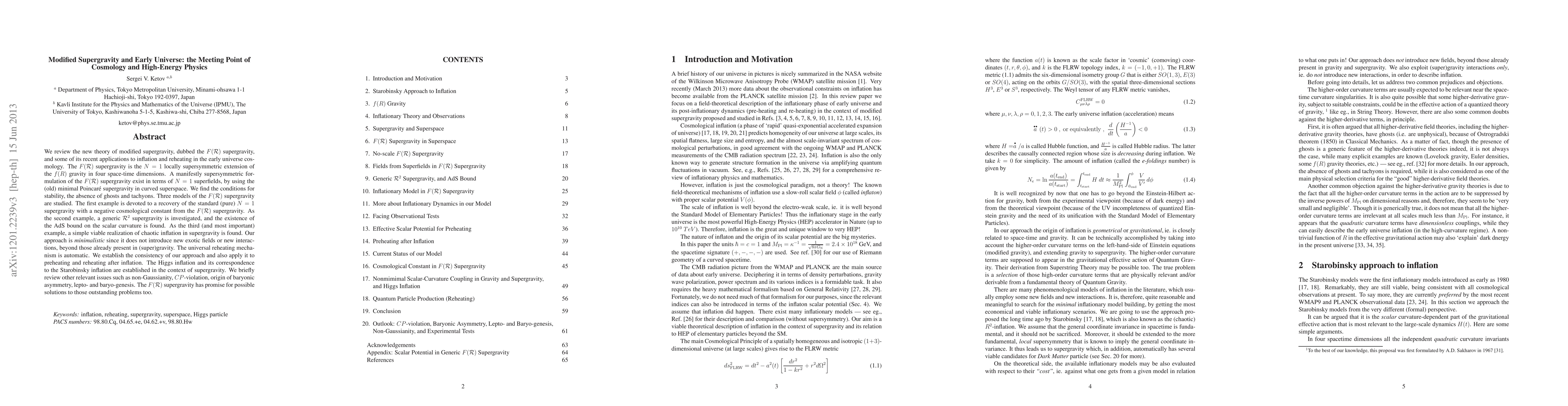 We review the new theory of modified supergravity, dubbed F(\cal R) supergravity, and some of its recent applications to inflation and reheating in the early universe cosmology. The F(\cal R) supergravity is the N=1 locally supersymmetric extension of the f(R) gravity in four space-time dimensions. A manifestly supersymmetric formulation of the F(\cal R) supergravity exist in terms of N=1 superfields, by using the (old) minimal Poincar'e supergravity in curved superspace. We find the conditions for stability, the absence of ghosts and tachyons. Three models of the F(\cal R) supergravity are studied. The first example is devoted to a recovery of the standard (pure) N=1 supergravity with a negative cosmological constant from the F(\cal R) supergravity. As the second example, a generic {\cal R}^2-type supergravity is investigated, and the existence of the AdS bound on the scalar curvature is found. As the third (and most important) example, a simple viable realization of chaotic inflation in supergravity is found. Our approach is {\it minimalistic} since it does not introduce new exotic fields or new interactions, beyond those already present in (super)gravity. The universal reheating mechanism is automatic. We establish the consistency of our approach and also apply it to preheating and reheating after inflation. The Higgs inflation and its correspondence to the Starobinsky inflation is established in the context of supergravity. We briefly review other relevant issues such as non-Gaussianity, CP-violation, origin of baryonic asymmetry, lepto- and baryo-genesis. The F(\cal R) supergravity has promise for possible solutions to those outstanding problems too.