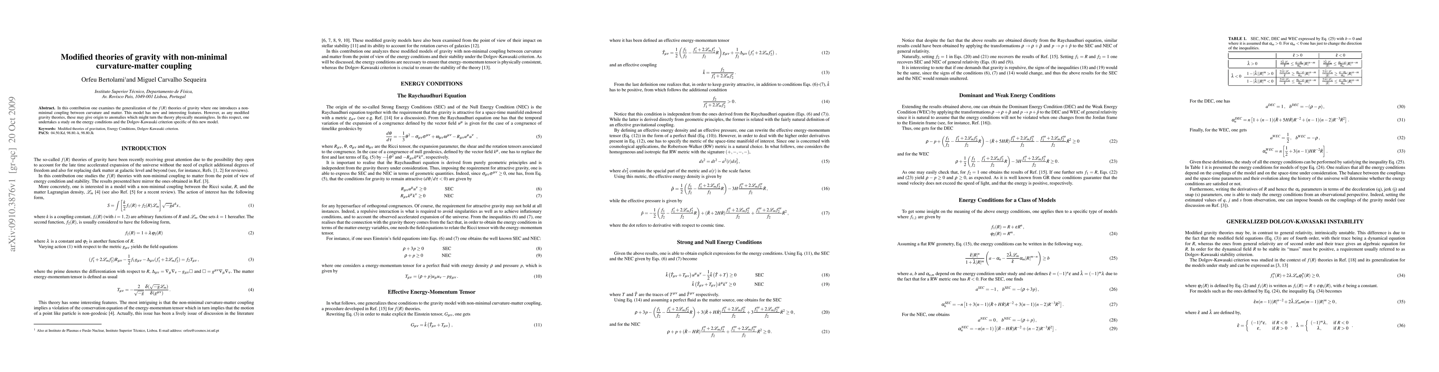 In this contribution one examines the generalization of the $f(R)$ theories of gravity where one introduces a non-minimal coupling between curvature and matter. This model has new and interesting features. %, specially concerning the energy exchange between the matter fields and the curvature. However, as any modified gravity theories, these may give origin to anomalies which might turn the theory physically meaningless. In this respect, one undertakes a study on the energy conditions and the Dolgov-Kawasaki criterion specific of this new model.