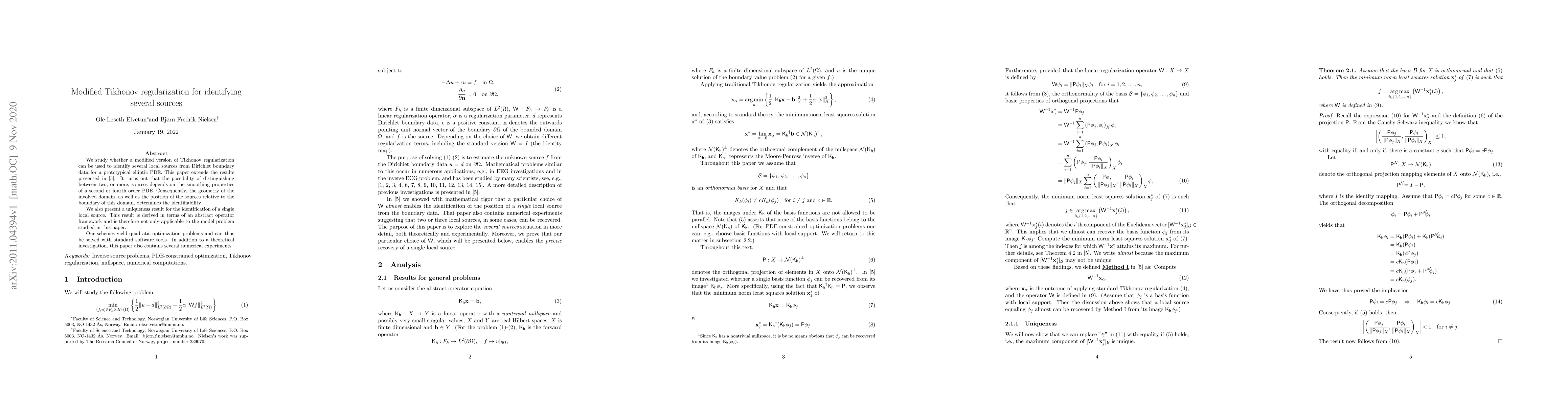 We study whether a modified version of Tikhonov regularization can be used to identify several local sources from Dirichlet boundary data for a prototypical elliptic PDE. This paper extends the results presented in [5]. It turns out that the possibility of distinguishing between two, or more, sources depends on the smoothing properties of a second or fourth order PDE. Consequently, the geometry of the involved domain, as well as the position of the sources relative to the boundary of this domain, determines the identifiability. We also present a uniqueness result for the identification of a single local source. This result is derived in terms of an abstract operator framework and is therefore not only applicable to the model problem studied in this paper. Our schemes yield quadratic optimization problems and can thus be solved with standard software tools. In addition to a theoretical investigation, this paper also contains several numerical experiments.