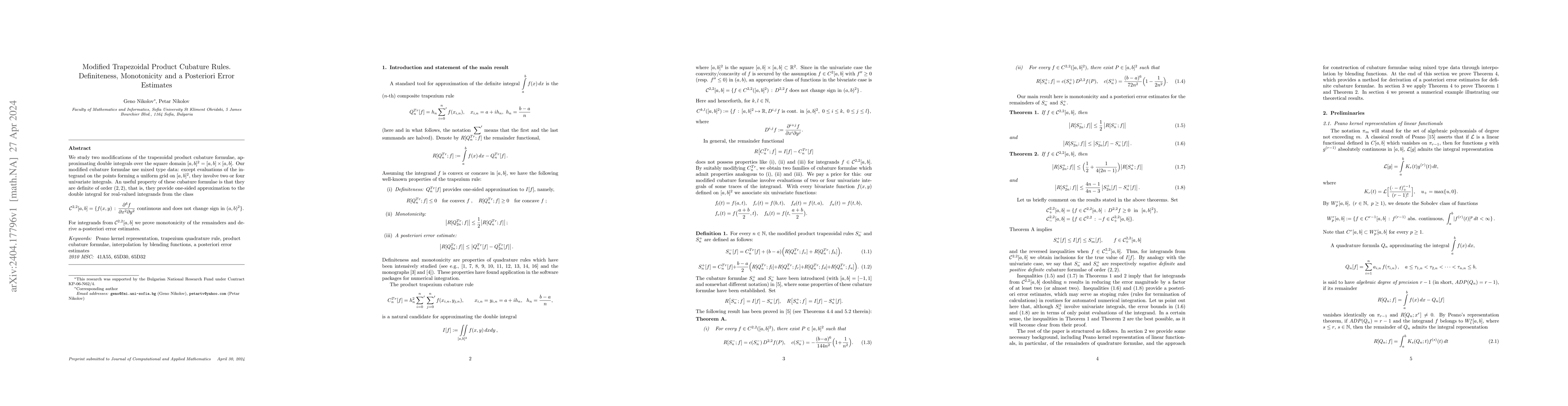 The paper proposes two modified trapezoidal product cubature rules for double integrals over $[a,b]^2$, involving mixed data types and univariate integrals. These cubature rules are shown to be definite of order $(2,2)$ and provide one-sided approximations for integrands from the class $\mathcal{C}^{2,2}[a,b]$. The paper also proves monotonicity of the remainders and derives a-posteriori error estimates.