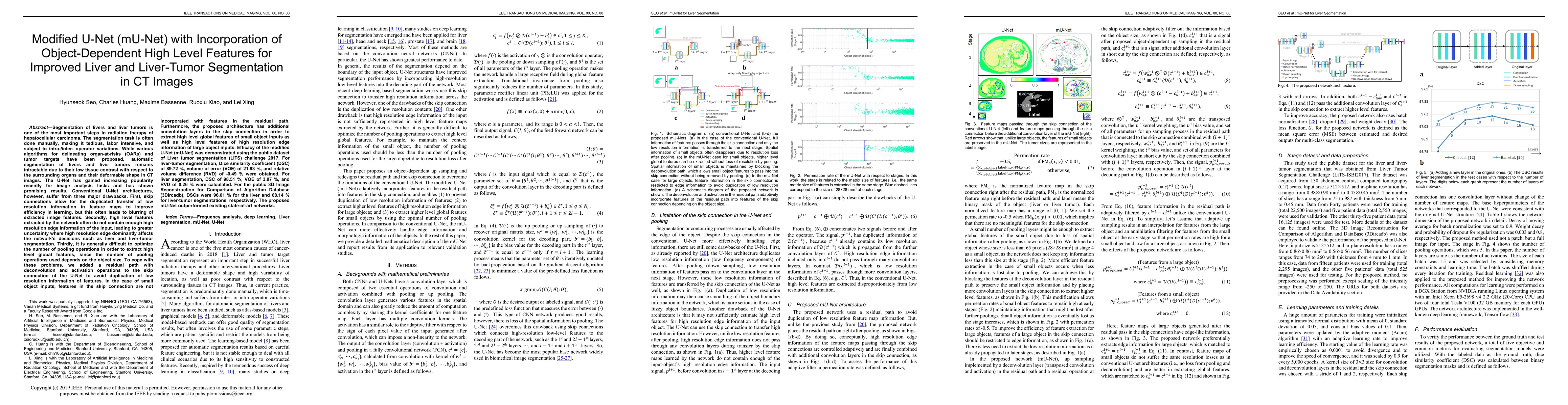 The paper proposes a modified U-Net (mU-Net) incorporating object-dependent high-level features to enhance liver and liver-tumor segmentation in CT images. The mU-Net addresses limitations of conventional U-Nets by adding residual paths and additional convolution layers to extract high-level features, achieving superior results in the LiTS challenge 2017 dataset.