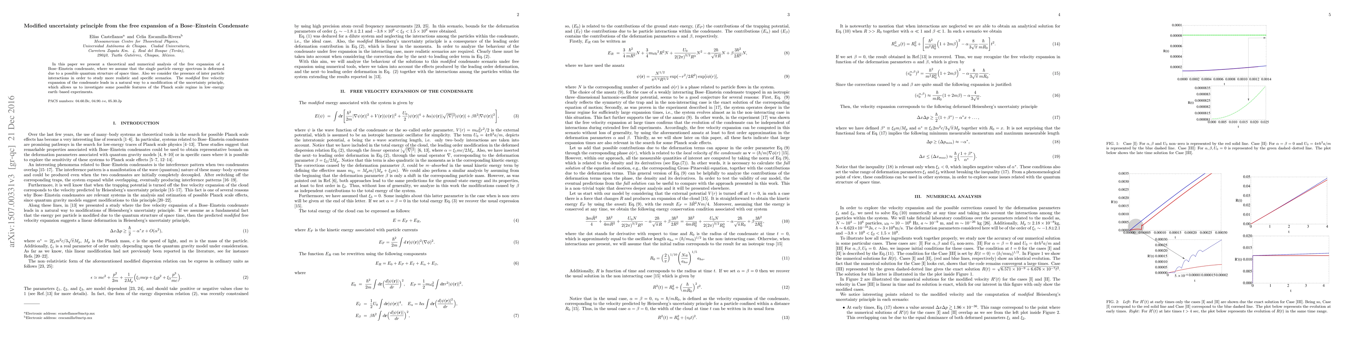 In this paper, we present a theoretical and numerical analysis of the free expansion of a Bose-Einstein condensate, where we assume that the single particle energy spectrum is deformed due to a possible quantum structure of spacetime. Also, we consider the presence of interparticle interactions in order to study more realistic and specific scenarios. The modified free velocity expansion of the condensate leads in a natural way to a modification of the uncertainty principle, which allows us to investigate some possible features of the Planck scale regime in low-energy earth-based experiments.