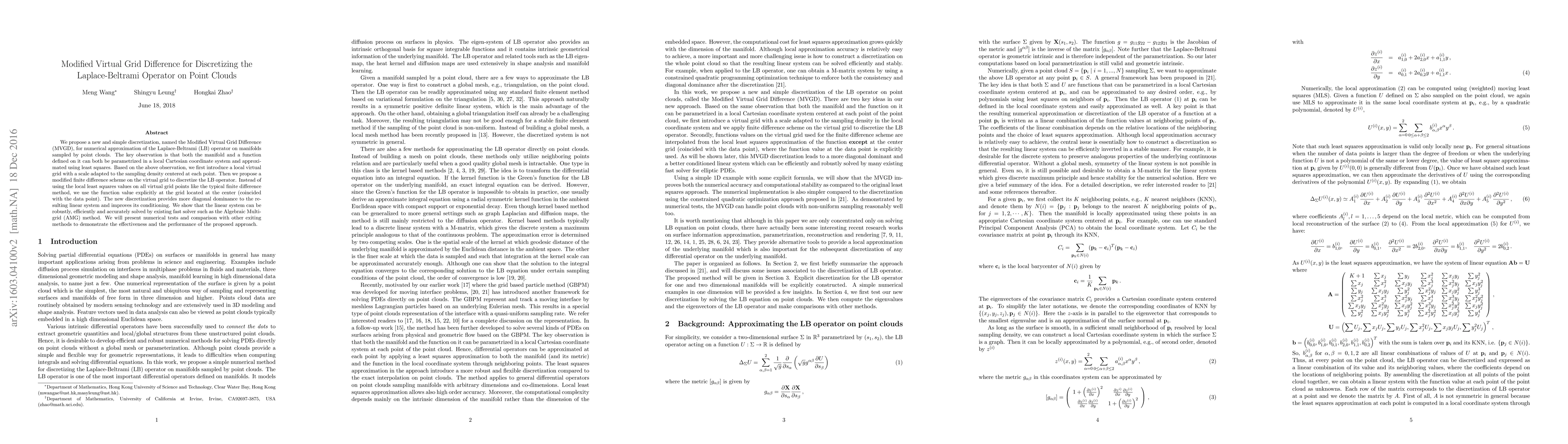 A new method called Modified Virtual Grid Difference (MVGD) is proposed for approximating the Laplace-Beltrami operator on point clouds, improving accuracy and efficiency through a novel discretization scheme.