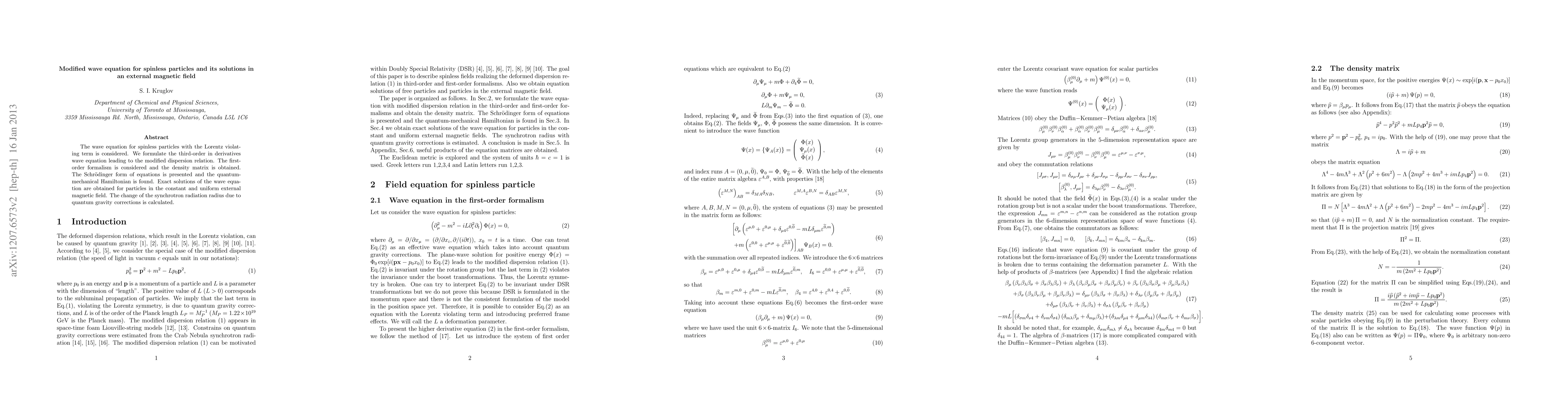The wave equation for spinless particles with the Lorentz violating term is considered. We formulate the third-order in derivatives wave equation leading to the modified dispersion relation. The first-order formalism is considered and the density matrix is obtained. The Schr\"{o}dinger form of equations is presented and the quantum-mechanical Hamiltonian is found. Exact solutions of the wave equation are obtained for particles in the constant and uniform external magnetic field. The change of the synchrotron radiation radius due to quantum gravity corrections is calculated.