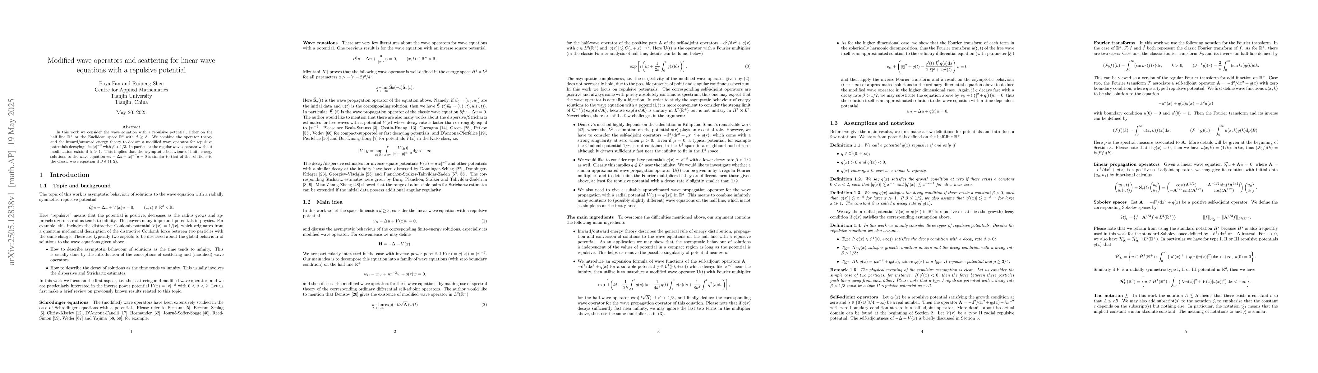Introduction of a modified wave operator approach for linear wave equations with repulsive potentials.