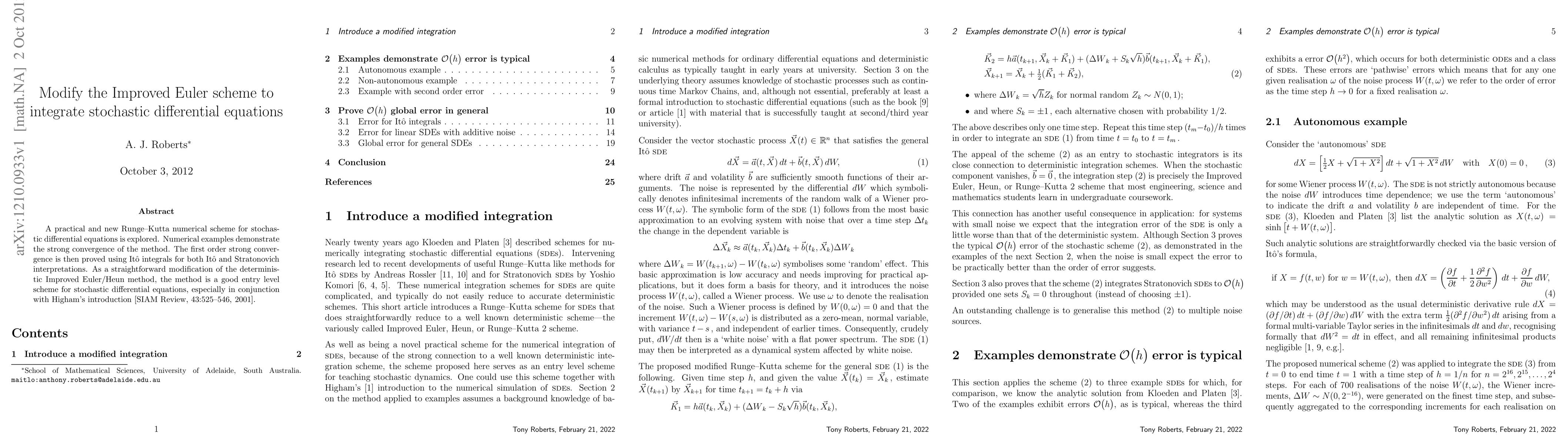 A practical and new Runge--Kutta numerical scheme for stochastic differential equations is explored. Numerical examples demonstrate the strong convergence of the method. The first order strong convergence is then proved using Ito integrals for both Ito and Stratonovich interpretations. As a straightforward modification of the deterministic Improved Euler/Heun method, the method is a good entry level scheme for stochastic differential equations, especially in conjunction with Higham's introduction [SIAM Review, 43:525--546, 2001].