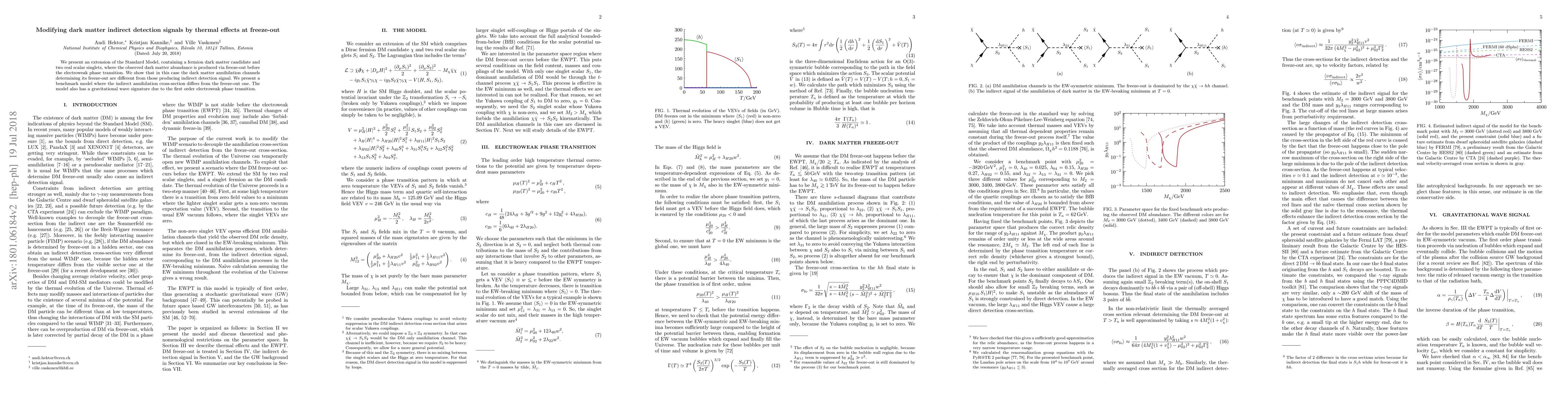 This paper extends the Standard Model with a fermion dark matter candidate and scalar singlets, proposing that dark matter abundance arises via freeze-out before the electroweak phase transition. It highlights a scenario where indirect detection signals differ from those determining freeze-out, with a benchmark model showcasing distinct annihilation cross-sections.