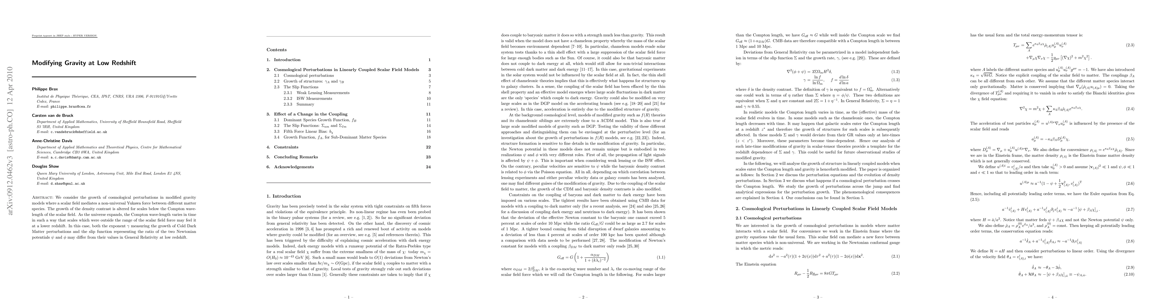 We consider the growth of cosmological perturbations in modified gravity models where a scalar field mediates a non-universal Yukawa force between different matter species. The growth of the density contrast is altered for scales below the Compton wave-length of the scalar field. As the universe expands, the Compton wave-length varies in time in such a way that scales which were outside the range of the scalar field force may feel it at a lower redshift. In this case, both the exponent $\gamma$ measuring the growth of Cold Dark Matter perturbations and the slip function representing the ratio of the two Newtonian potentials $\psi$ and $\phi$ may differ from their values in General Relativity at low redshift.