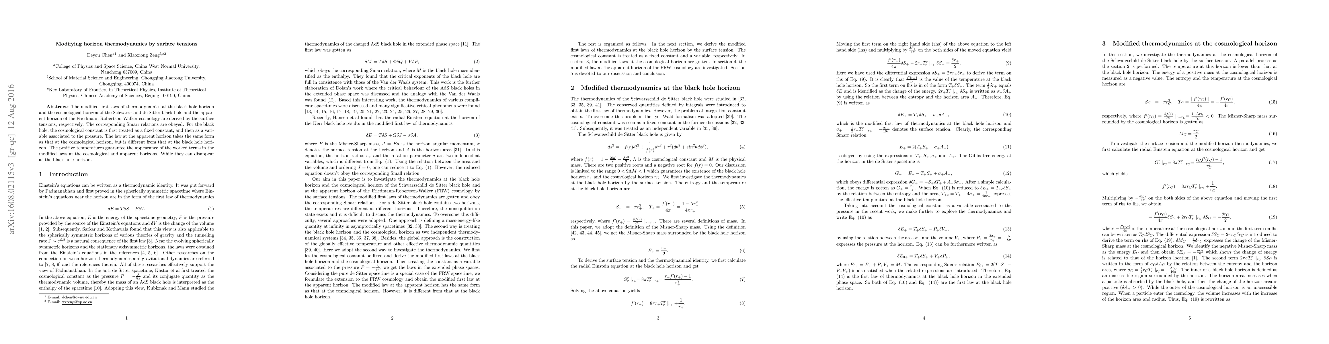 Researchers derived modified thermodynamic laws for black holes and cosmologies using surface tensions, revealing distinct temperature effects at each horizon.