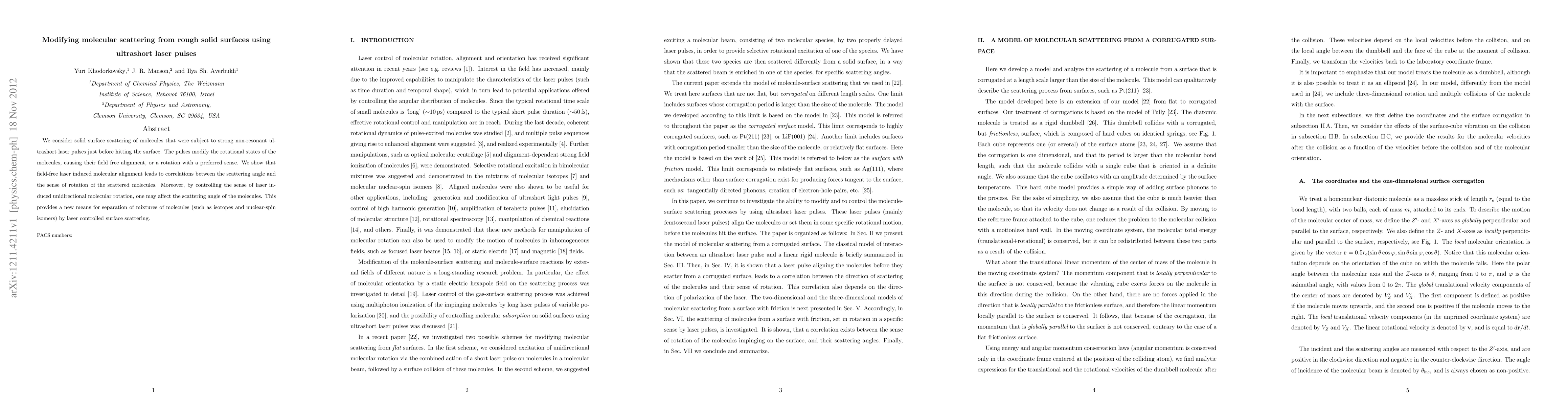 This study demonstrates how ultrashort laser pulses can modify molecular scattering from rough solid surfaces by altering the rotational states of molecules, leading to a correlation between scattering angle and rotation sense. This method enables laser-controlled separation of molecular mixtures via surface scattering.