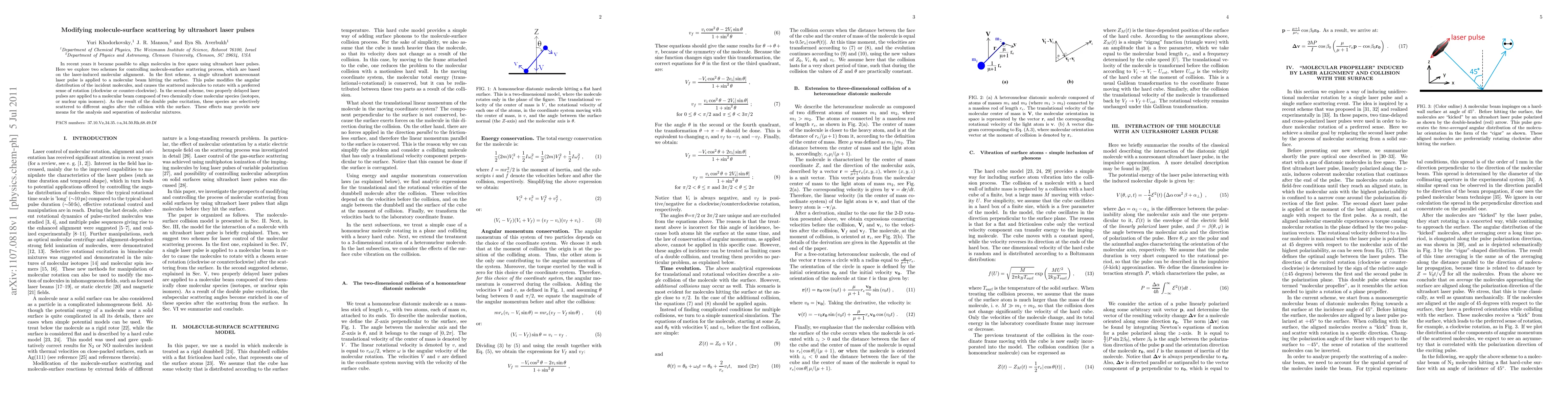 This research investigates two methods to control molecule-surface scattering using ultrashort laser pulses. The first uses a single pulse to modify angular distribution and induce preferred rotation in scattered molecules. The second employs two delayed pulses to selectively scatter different molecular species to distinct angles, potentially enabling new analysis and separation techniques for molecular mixtures.