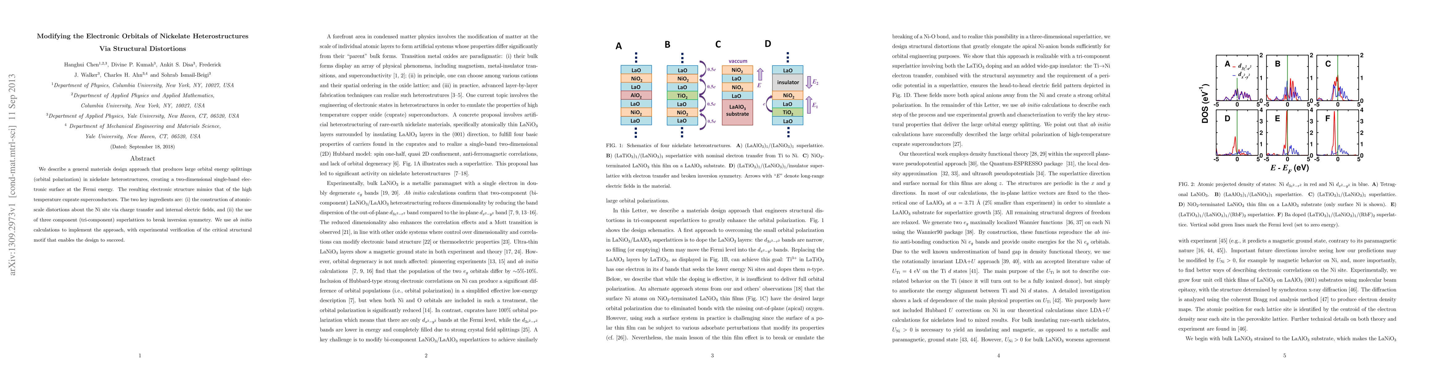 This paper proposes a materials design approach to create large orbital energy splittings in nickelate heterostructures, leading to a two-dimensional single-band electronic structure similar to high-temperature cuprate superconductors. The method involves inducing atomic-scale distortions via charge transfer and employing tri-component superlattices to break inversion symmetry, supported by {\it ab initio} calculations and experimental verification.