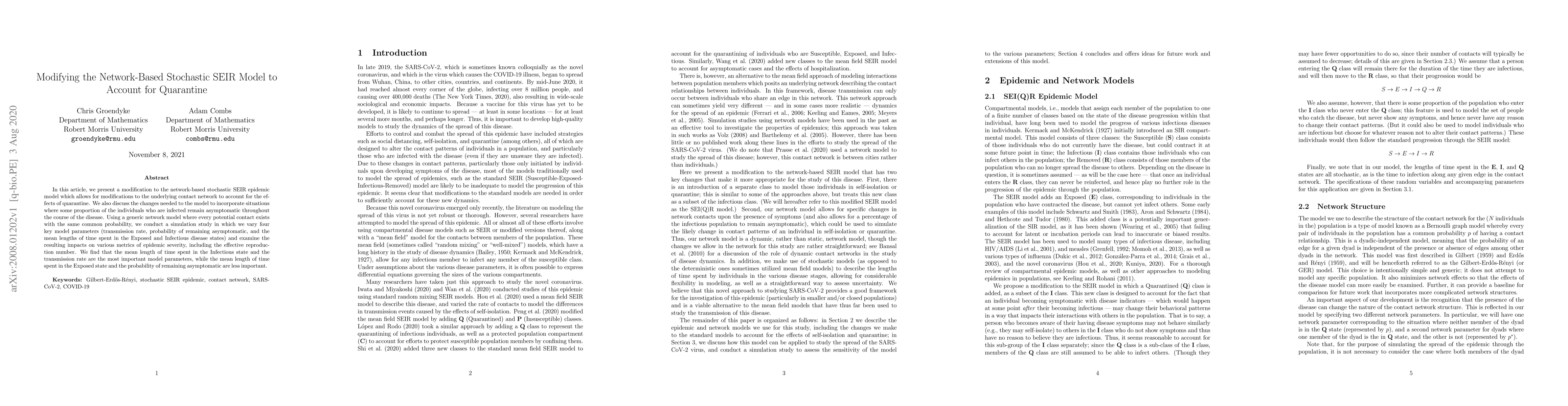 In this article, we present a modification to the network-based stochastic SEIR epidemic model which allows for modifications to the underlying contact network to account for the effects of quarantine. We also discuss the changes needed to the model to incorporate situations where some proportion of the individuals who are infected remain asymptomatic throughout the course of the disease. Using a generic network model where every potential contact exists with the same common probability, we conduct a simulation study in which we vary four key model parameters (transmission rate, probability of remaining asymptomatic, and the mean lengths of time spent in the Exposed and Infectious disease states) and examine the resulting impacts on various metrics of epidemic severity, including the effective reproduction number. We find that the mean length of time spent in the Infectious state and the transmission rate are the most important model parameters, while the mean length of time spent in the Exposed state and the probability of remaining asymptomatic are less important.
